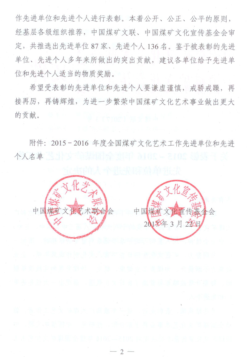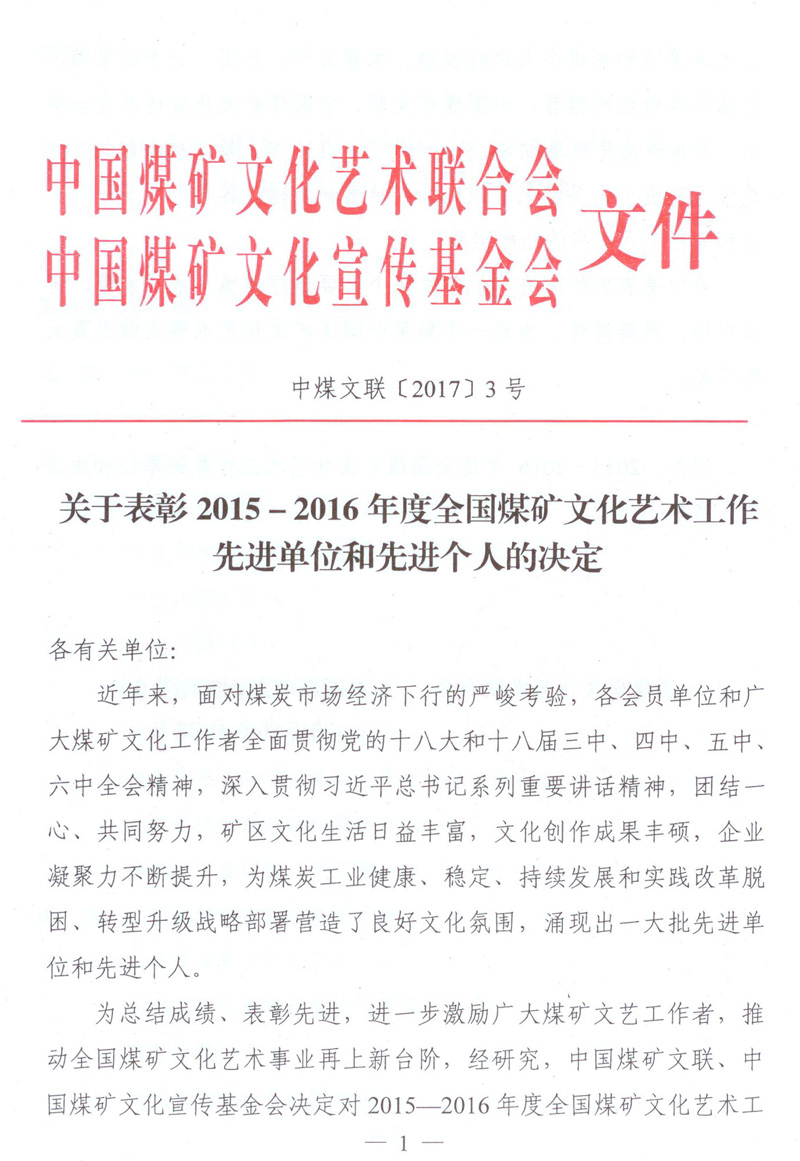 關于表彰2015—2016年度全國煤礦文化藝術工作先進單位和先進個人的決定