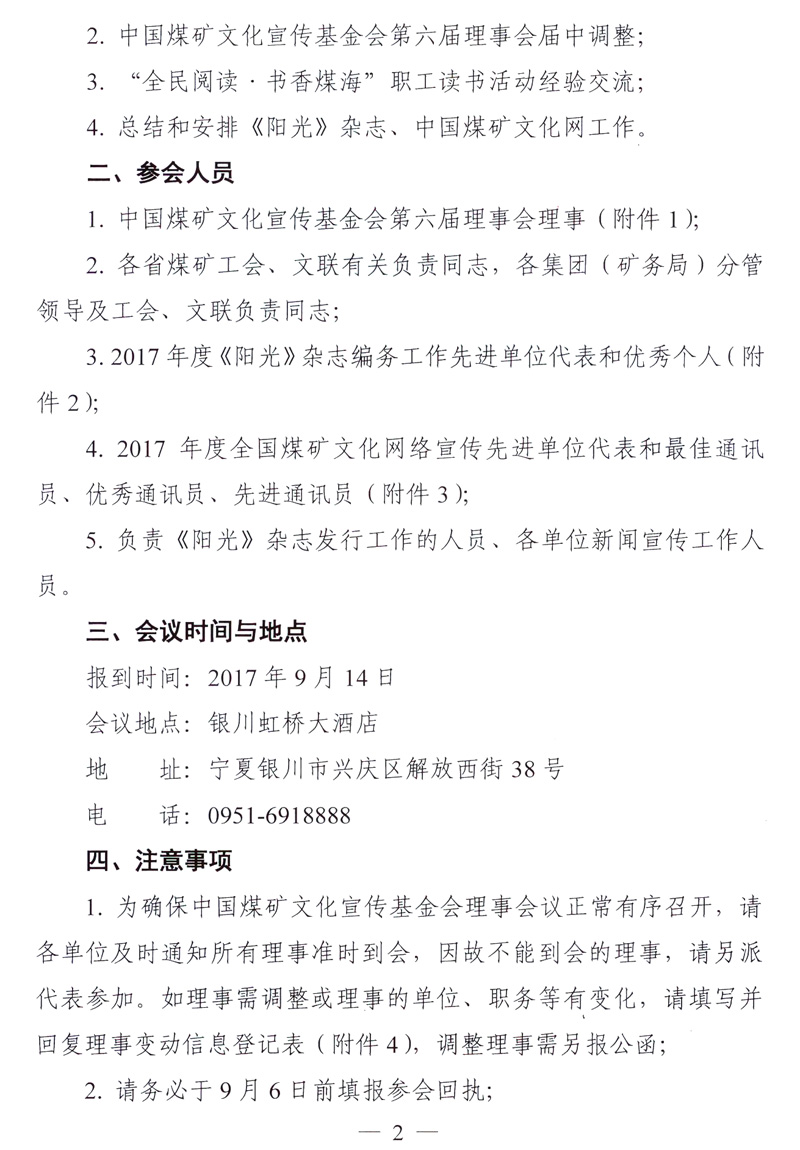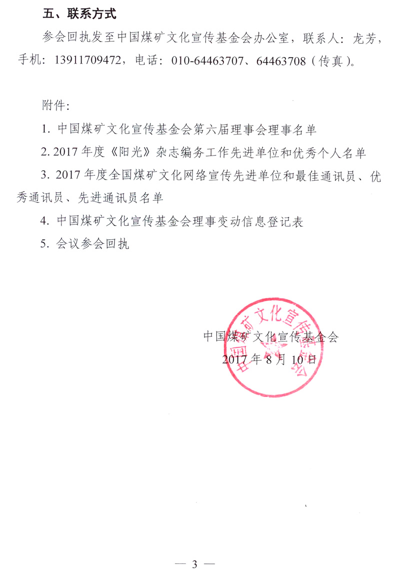 關于召開中國煤礦文化宣傳基金會第六屆理事會第九次會議的通知 來源:中國煤礦文化宣傳基金會 作者: 時間:2017-08-21 【字體:小 大】 附件: 1. 中國煤礦文化宣傳基金會第六屆理事會理事名單 2. 2017年度《陽光》雜志編務工作先進單位和優秀個人名單 3. 2017年度全國煤礦文化網絡宣傳先進單位和最佳通訊員、優秀通訊員、先進通訊員名單 4. 中國煤礦文化宣傳基金會理事變動信息登記表 5. 會議參會回執 智能標簽: 中國煤礦文化宣傳基金會 相關內容 分享到: 【打印正文】