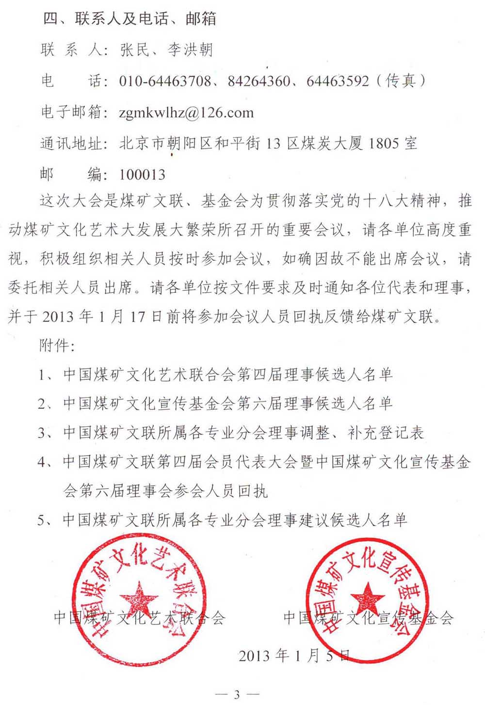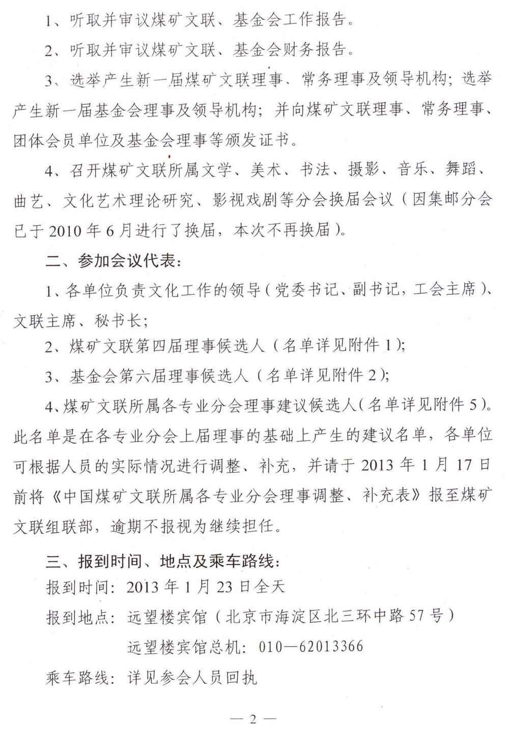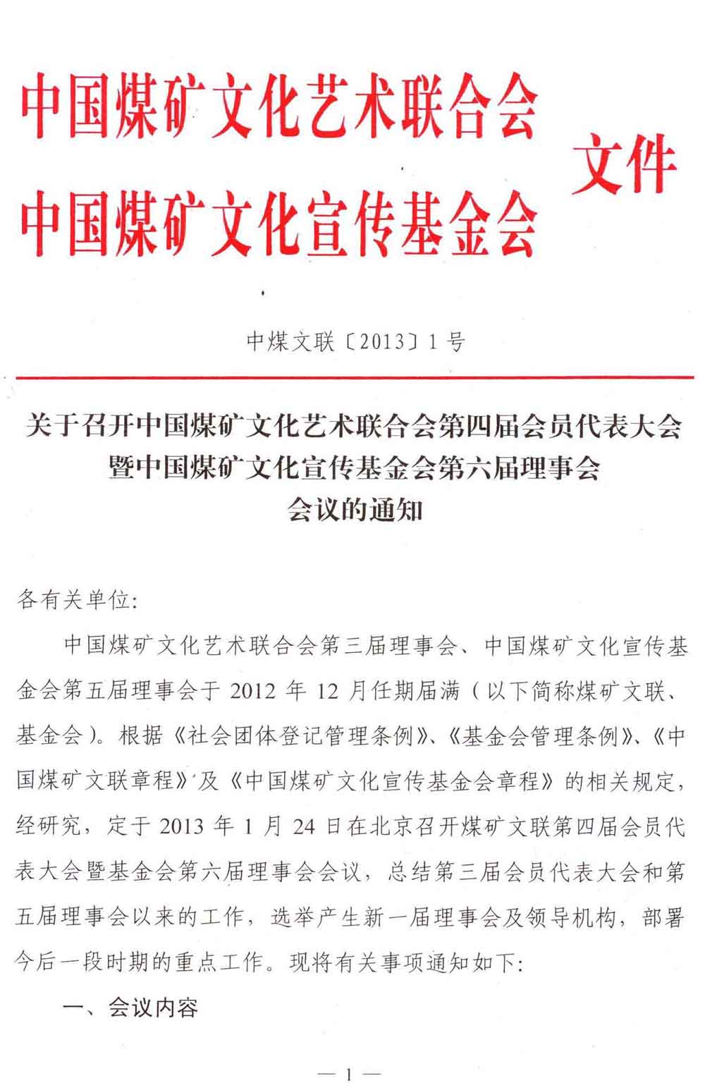 關于召開中國煤礦文化藝術聯合會第四屆會員代表大會暨中國煤礦文化宣傳基金會第六屆理事會會議的通知 來源:中國煤礦文化網 作者:煤礦文聯 時間:2013-01-06 【字體:小 大】 附件: 1、中國煤礦文化藝術聯合會第四屆理事候選人名單 2、中國煤礦文化宣傳基金會第六屆理事候選人名單 3、中國煤礦文聯所屬各專業分會理事調整、補充登記表 4、中國煤礦文聯第四屆會員代表大會暨中國煤礦文化宣傳基金會第六屆理事會參會人員回執 5、中國煤礦文聯所屬各專業分會理事建議候選人名單 分享到: 【打印正文】
