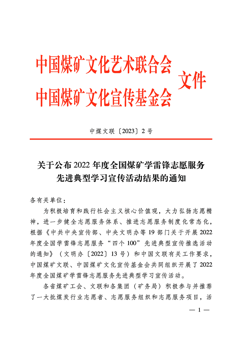 關(guān)于公布2022年度全國煤礦學(xué)雷鋒志愿服務(wù)先進典型學(xué)習(xí)宣傳活動結(jié)果的通知