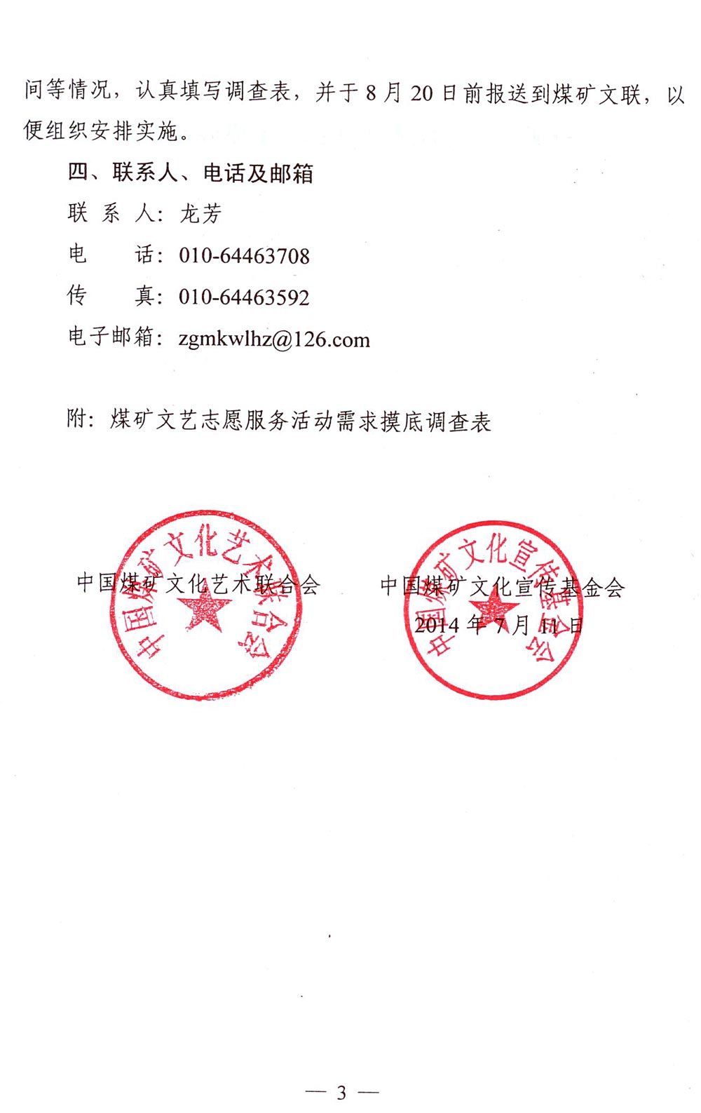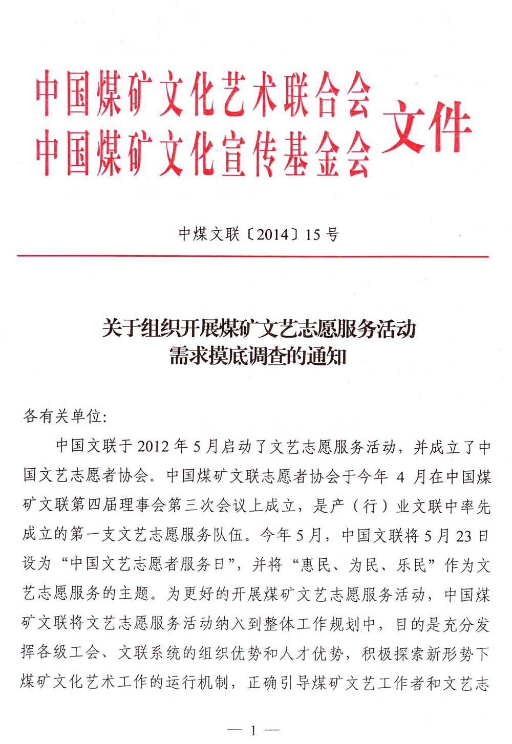 關(guān)于組織開展煤礦文藝志愿服務(wù)活動(dòng)需求摸底調(diào)查的通知 來源:中國煤礦文聯(lián) 作者: 時(shí)間:2014-07-15 【字體:小 大】 附:煤礦文藝志愿服務(wù)活動(dòng)需求摸底調(diào)查表 分享到: 【打印正文】
