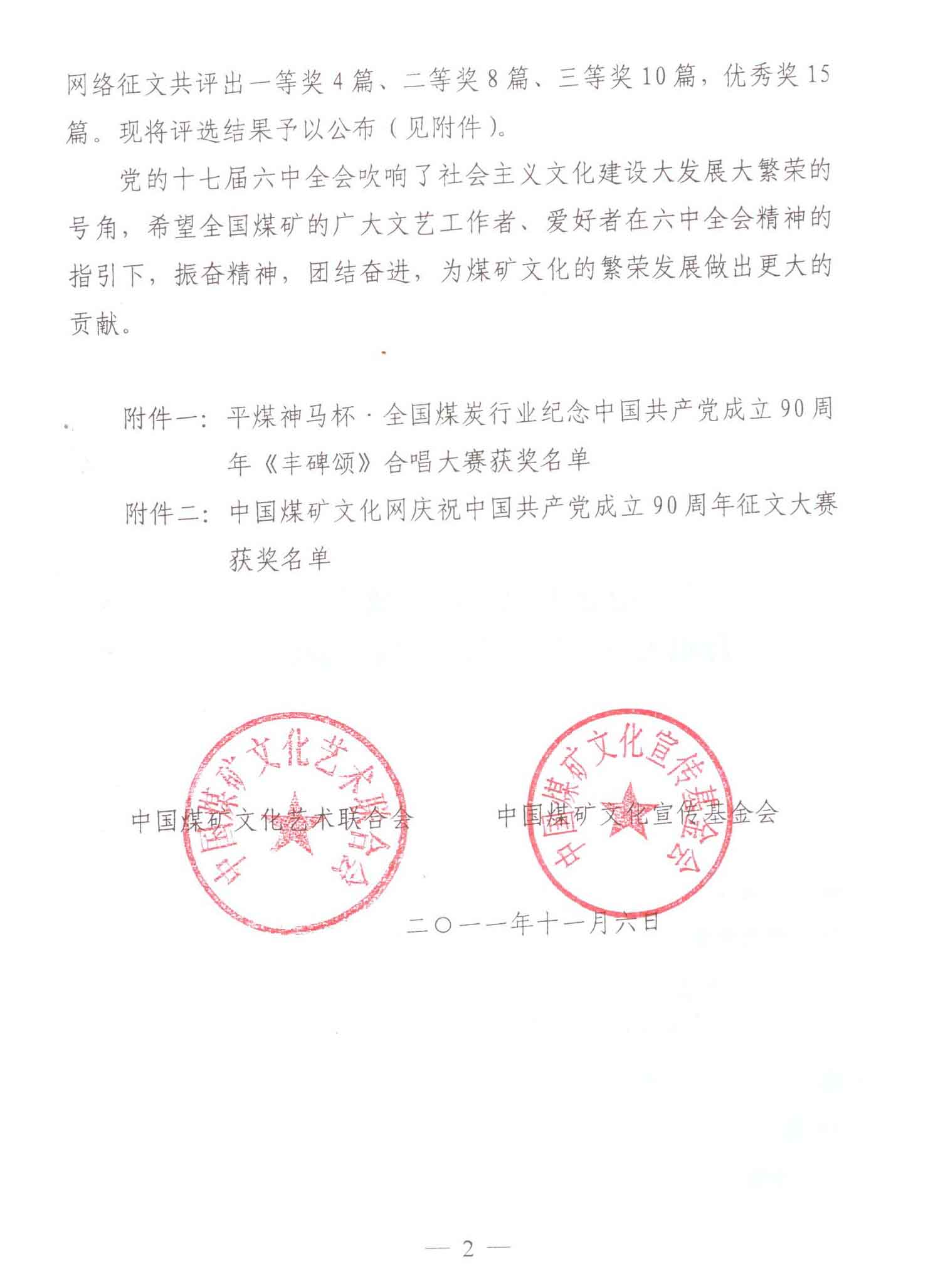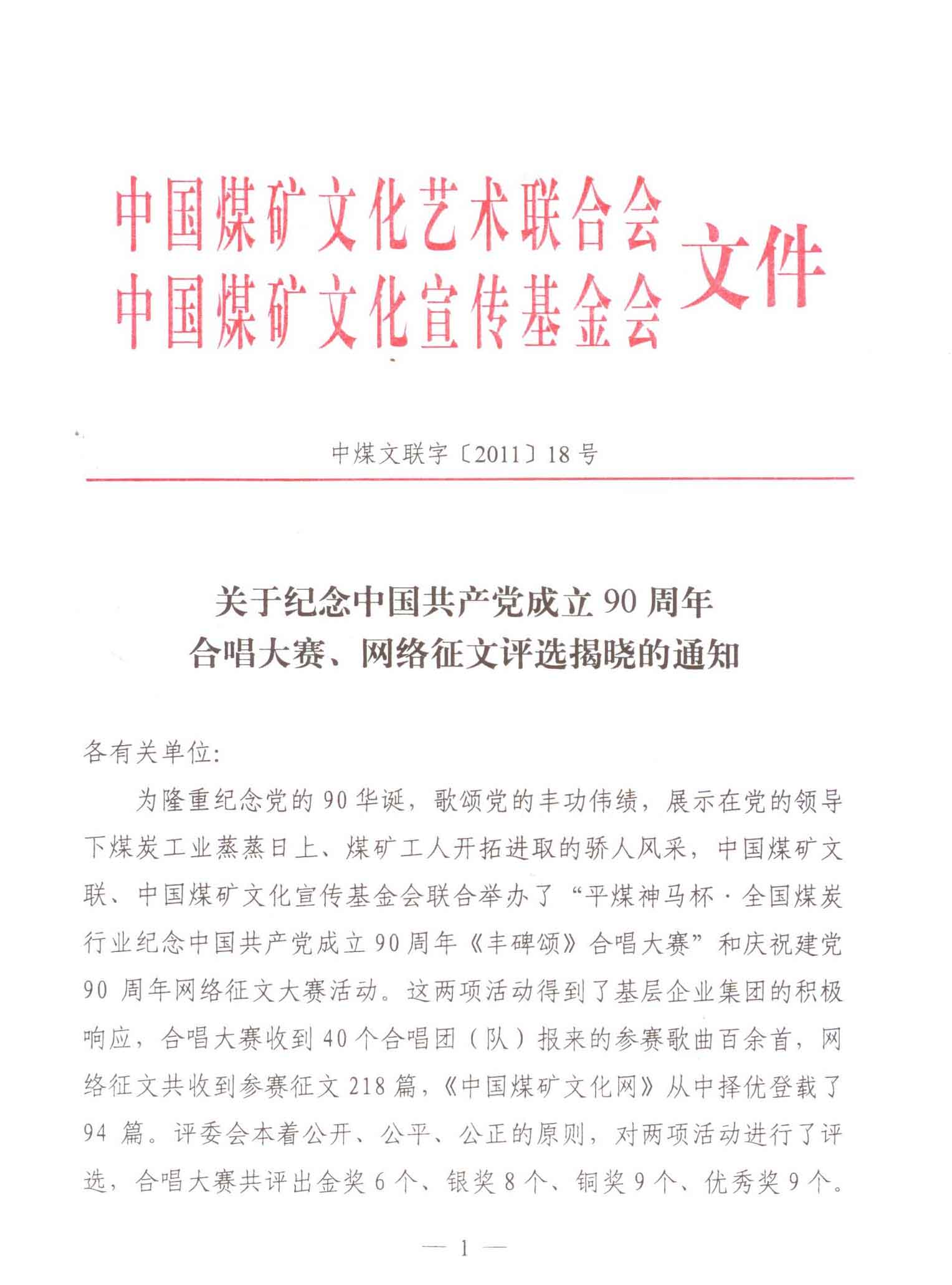 關(guān)于紀念中國共產(chǎn)黨成立90周年合唱大賽、網(wǎng)絡(luò)征文評選揭曉的通知 來源:中國煤礦文化網(wǎng) 作者:煤礦文聯(lián) 時間:2011-11-14 【字體:小 大】 附件1:平煤神馬杯全國煤炭行業(yè)紀念中國共產(chǎn)黨成立90周年《豐碑頌》合唱大賽獲獎名單 附件2:中國煤礦文化網(wǎng)慶祝中國共產(chǎn)黨成立90周年征文大賽獲獎名單 分享到: 【打印正文】