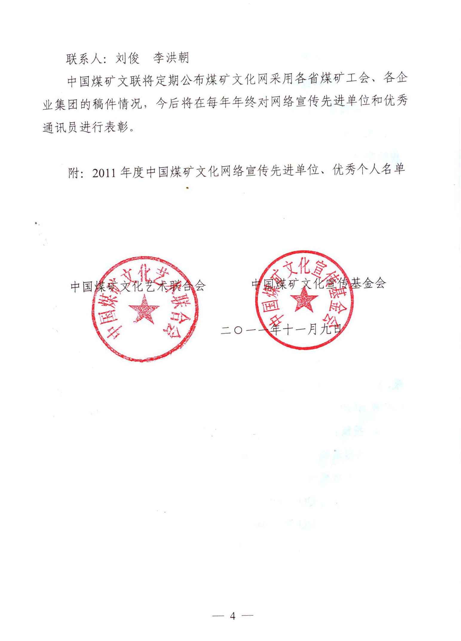 關于表彰2011年度全國煤礦文化網絡宣傳先進單位、優秀個人暨中國煤礦文化網新版上線的通知 來源:中國煤礦文化網 作者:煤礦文聯 時間:2011-11-15 【字體:小 大】 附:2011年度中國煤礦文化網絡宣傳先進單位、優秀個人名單 分享到: 【打印正文】