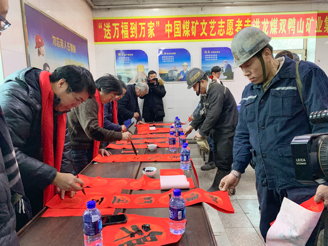 1月14日至16日,迎著東北的瑞雪,中國(guó)煤礦文聯(lián)組織文藝志愿者走進(jìn)龍煤雙鴨山礦業(yè)集團(tuán)開(kāi)展“送萬(wàn)福進(jìn)萬(wàn)家”文藝志愿服務(wù)活動(dòng)。中國(guó)煤礦文聯(lián)秘書(shū)長(zhǎng)、中國(guó)煤礦文化宣傳基金會(huì)秘書(shū)長(zhǎng)、中國(guó)煤礦文聯(lián)志愿者協(xié)會(huì)主席盛軍帶隊(duì),中國(guó)煤礦文聯(lián)宣傳處副處長(zhǎng)、中國(guó)煤礦文聯(lián)志愿者協(xié)會(huì)秘書(shū)長(zhǎng)辛凡忠,煤礦書(shū)協(xié)副主席馬銘、楊玉劍,煤礦書(shū)協(xié)原副主席呂洪冰,煤礦書(shū)協(xié)理事郭春峰,煤礦書(shū)法家張雅森等參加文藝志愿服務(wù),龍煤集團(tuán)工會(huì)副主席劉建平,龍煤雙鴨山礦業(yè)集團(tuán)黨委副書(shū)記、工會(huì)主席林森,龍煤雙鴨山礦業(yè)集團(tuán)工會(huì)副主席邵靜等帶領(lǐng)文藝志愿者們冒著零下18度的嚴(yán)寒先后在龍煤雙鴨山礦業(yè)集團(tuán)機(jī)關(guān)、東榮一礦和東榮二礦為礦區(qū)干部職工們寫(xiě)春聯(lián)、送“福”字。志愿服務(wù)現(xiàn)場(chǎng)喜氣洋洋、熱鬧和諧,礦工兄弟們紛紛為文藝志愿者“點(diǎn)贊”。活動(dòng)期間,共創(chuàng)作贈(zèng)送“福”字300多個(gè),春聯(lián)300多幅,書(shū)法作品50余幅。