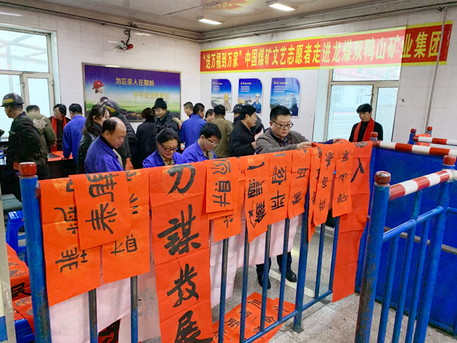 在東榮一礦,幾十名剛升井的工人和職工代表在井口等候文藝志愿者的到來(lái)。“春節(jié)快到了,聽(tīng)說(shuō)今天中國(guó)煤礦文聯(lián)組織到礦上文藝志愿服務(wù),我特別高興,今年的春節(jié)能貼上咱們煤礦書(shū)法家們寫(xiě)的對(duì)聯(lián)和‘福’字,是喜上加喜呀。”一位穿著工作服的職工說(shuō)。志愿服務(wù)現(xiàn)場(chǎng),志愿者和礦區(qū)職工們的臉上都洋溢著笑容,書(shū)法家們一邊埋頭創(chuàng)作,一邊不斷點(diǎn)頭示意,逐個(gè)記錄下礦工們介紹著自己的單位和部門(mén),有的說(shuō)要貼在職工之家,有的是區(qū)隊(duì)辦公室,有的是黨建工作室……“我喜歡這一幅。”一位小伙子舉著一幅“迎新春年年如意,接鴻福步步登高”的春聯(lián)說(shuō)。