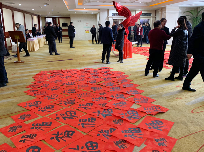 在新時(shí)代煤炭工業(yè)勞模事跡報(bào)告會(huì)(龍煤專(zhuān)場(chǎng))會(huì)場(chǎng)外,文藝志愿者們?cè)缭缱骱昧藴?zhǔn)備。“今天是獲得全國(guó)煤炭工業(yè)先進(jìn)集體和勞動(dòng)模范的代表們來(lái)開(kāi)會(huì),我們要多寫(xiě)一些‘福’字和春聯(lián)”送給他們,并通過(guò)他們向龍煤集團(tuán)的礦工兄弟送上新春的祝福。”盛軍邊寫(xiě)邊說(shuō)。一旁參加會(huì)議的職工代表們喜笑顏開(kāi),一張張“福”字和一對(duì)對(duì)春聯(lián)在書(shū)法家們的手中寫(xiě)就,職工們紛紛幫著拿起來(lái)鋪到會(huì)場(chǎng)前廳的地上。“來(lái),我給二位挑兩幅春聯(lián)。”盛軍對(duì)著兩名身披綬帶的勞模代表說(shuō)到。文藝志愿者們一邊寫(xiě)一邊送,一幅幅飽含春意的“福”字和春聯(lián)送到了龍煤集團(tuán)的勞模和職工代表們手中。