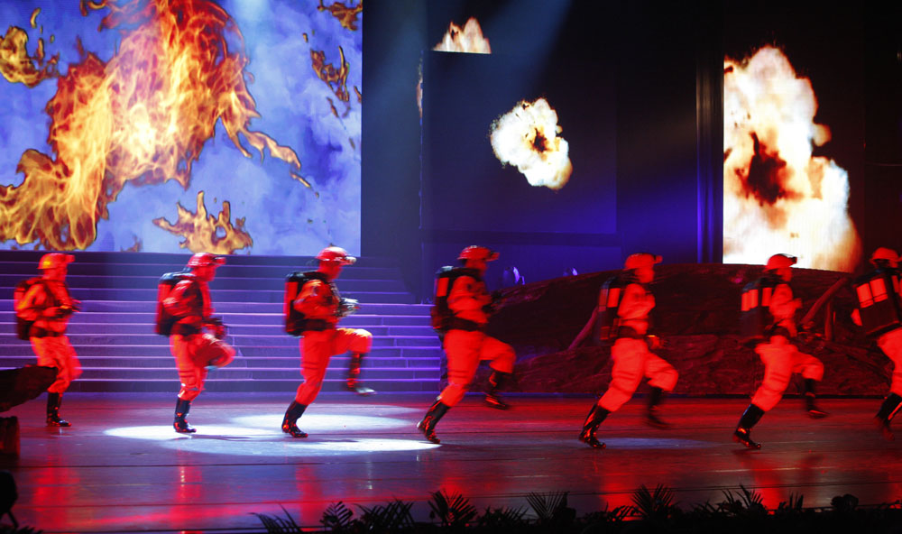 在歡樂喜慶的氛圍中,來自全國各礦區的煤礦職工和藝術家紛紛登臺,用精彩的節目演繹出了礦工的豪邁、激情與力量。歌曲《青春礦山》、《風中的樹》、《太陽的故事》充滿了濃郁的煤礦特色,唱出了礦山的朝氣蓬勃、礦區的和諧美好;舞蹈《礦山情》描繪的是一群年輕的礦工下井前在休息室里的生活場景,用輕松、快樂、幽默的舞蹈動作,彰顯了勞動幸福、勞動光榮的本色;舞蹈《礦山夕陽好》的表演者平均年齡65歲,這些煤礦老人用他們詼諧、風趣的表演,向觀眾展示了礦山今天老有所養、老有所為、老有所樂的美好生活;新創作的音詩畫《中國礦工》格外感人,節目講述了新中國成立64年來煤礦工人為共和國發展作出的偉大貢獻,打動了在場的每一個人;新創舞蹈《守護》是演出中的一個亮點,25名舞蹈演員全部來自山東能源淄博礦業集團礦山救護大隊。這群礦山救護隊員們用他們鏗鏘有力的舞蹈形象展示了礦山救護的場景,詮釋了礦山平安使者、礦工生命守護神的無私和勇敢;新創山東快書《希望礦山》在抑揚頓挫的說唱和優美動人的舞蹈中,活靈活現地表達了煤礦職工滿懷信心創造美好生活的喜悅心情;節目《水墨丹青》中5位煤礦書畫藝術家現場創作,通過先進的光影技術將書畫過程呈現在舞臺屏幕上,使書畫藝術與舞蹈完美地融合在一起,這在國內尚屬首次;新創戲歌《百花爭艷》,以熱情奔放的豫劇,呈現了一幅煤礦文化百花盛開,爭奇斗艷的盛景。