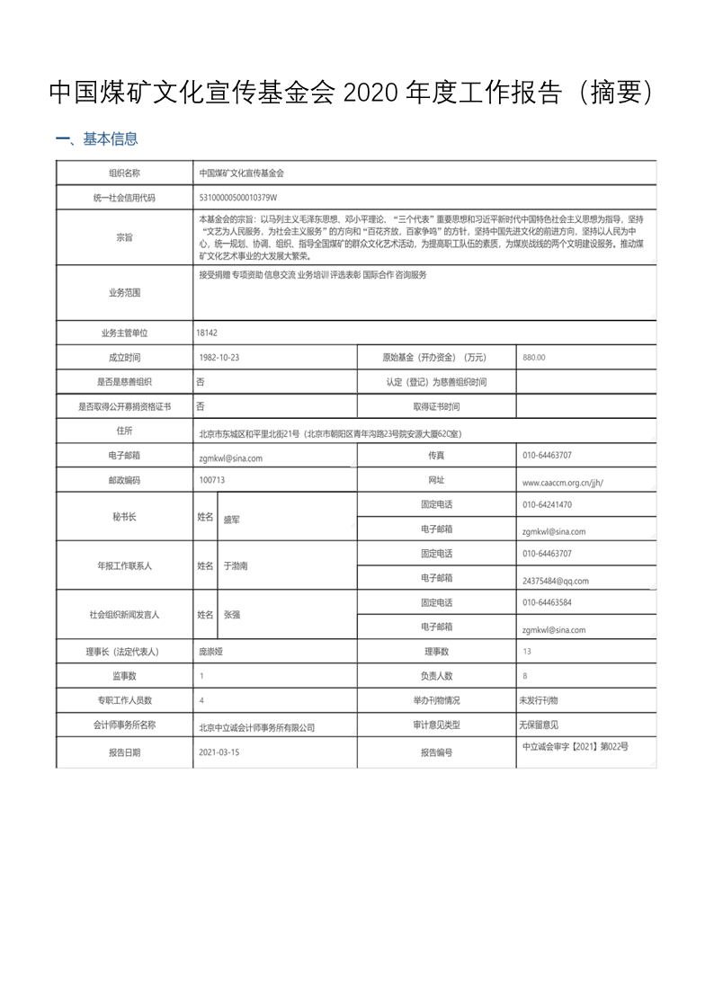 中國煤礦文化宣傳基金會2020年度工作報告(摘要) 來源: 作者: 時間:2021-09-27 【字體:小 大】 中國煤礦文化宣傳基金會2020年度工作報告(以下簡稱“報告”)已經登記管理機關審查通過,根據《基金會管理條例》規定,現將報告(摘要)公布如下: 分享到: 【打印正文】