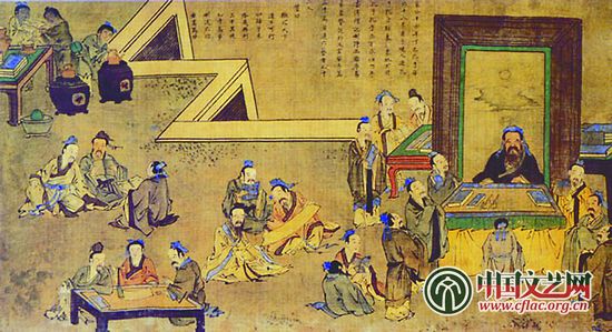 中國藝術教育源遠流長。我國藝術教育的最初形式為“樂教”,“興于詩,立于禮,成于樂”,是孔子對此進行的概括總結。詩、禮、樂,是藝術的三種樣式,也是教育的三種方式,藝術與教育合而為一,藝術教育是成就人生最高境界的關鍵要素。上圖分別為《孔子圣跡圖之杏壇禮樂》(左)、《樂舞百戲圖(兩城山漢畫像石拓片)》