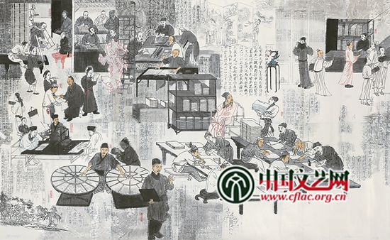 與以往歷史畫創作技法、材質多出于中國工筆畫、油畫和單體雕塑不同,此次歷史畫創作的畫種擴充了版畫和多人物組雕、浮雕、類裝置形式。這是因為版畫作為重要的美術形式之一,近年來在國內諸多主題性大型美術創作活動中彰顯了豐富的表現力和承載可塑性。版畫家通過多版拼接、母版展示等手法,大大增強了版畫藝術的視覺效應和形式張力。此次歷史畫創作有17位著名版畫家擔綱作品創作,他們充分挖掘材質潛力和技術語言特色,取得了超乎預期的效果。如鄔繼德的《雕版印刷》、代大權的《唐宋八大家》、戚序等人的《中華營造法式》以及趙宗藻、蔡峰等作者的《中國傳統四大節日》等作品。而通常以歷史人物肖像為主的雕塑,此次也推出了除人物圓雕以外的組合性群雕、浮雕形式的作品,以多人物組合到情景組合、具裝飾意味的壁雕等,增強了人物和由人物展開的歷史事件的豐富性。在風格多樣的國畫、油畫作品中,作者們更是力求在畫面結構新穎獨特基礎上吸收更多不同的形式語言和表現技巧,除糅進了前述自古典主義以降至現代主義、后現代主義諸種流派手法的同時,還融入了風俗畫、壁畫和裝飾繪畫的多重元素,為的是極盡所能,使作品得以最完美的呈現。