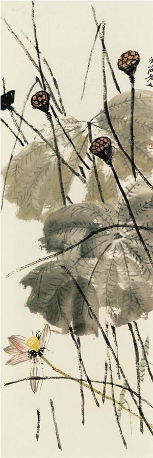 中國畫家愛畫荷花,遠的有明末清初的八大山人和惲壽平,近代的中國畫大師吳昌碩、齊白石、張大千、潘天壽、劉海粟、李苦禪、石魯等,都是畫荷花的妙手。八大山人的荷花殘敗荒涼,惲壽平的荷花工筆規整,吳昌碩的荷花金石味濃,齊白石的荷花豪放大氣,張大千的荷花婀娜多姿,潘天壽的荷花剛健挺拔,劉海粟的荷花潑彩濃艷,李苦禪的荷花鐵筆酣暢,石魯的荷花夸張簡練,每個人都對荷花有自己的刻畫和解釋。但若論最奔放寫意,淋漓痛快,則非齊白石的荷花莫屬。齊白石畫的荷花也是經歷了一個由簡到繁的過程,晚年的荷花墨色淋漓,色彩艷麗,穿插繁密,筆勢豪放,將荷花的寫意描繪推高到一個新的境界。
