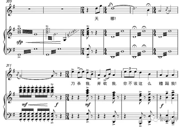 唱段與西洋歌劇詠嘆調(diào)有共同處,也有不同處。共同處在于人物從宣敘調(diào)到詠嘆調(diào),有快有慢,自由抒發(fā),不同處則是西洋詠嘆調(diào)大部分由三部曲式構(gòu)成,A、B、A,每段有高潮、有高音,最后往往結(jié)束在一個(gè)高音上。中國(guó)歌劇唱段可能沒(méi)有最后高音,卻于每段中出現(xiàn)高音。開(kāi)頭便是“曲首冠音”,一下子就到G,用以表現(xiàn)情緒的高度激憤。