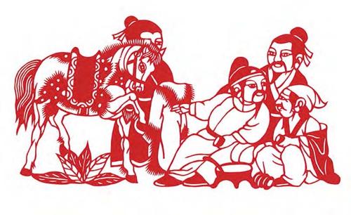 《回鄉(xiāng)偶書》被非遺傳承人范祚信制作成剪紙,畫面結(jié)構(gòu)并不復雜,一棵樹、三四個頑童,還有一位歸家的游子,略顯難為情的背對眾人。不僅每人表情略有不同,衣服上的褶皺也極為纖細精致,勾勒出一幅“回鄉(xiāng)”圖景。