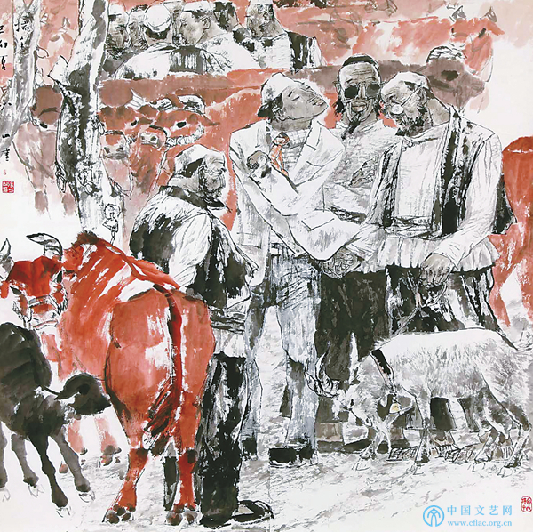 作家張賢亮在評價張少山的畫作時,曾開門見山地說,“每讀少山的畫作,他對線條的特殊處理,都給我很深的感受”,真是一語破的,張少山的作品給人印象最深的就是線的無處不在,本來中國畫的最主要特征就是“以寫為法”“以骨為質”。張少山緊緊抓住了中國畫以線造型、筆墨傳情的精神實質和核心內容,將線由單純描寫物象的形態,升華為同時表達不同情感內容的線意,因此在不同內涵的作品中便產生了不同的線描。試看《揣手》中表現敦厚老人用的稚拙剛勁的線、《白色蓋頭》中刻畫慈祥老婦用的圓潤柔和的線、《唐人賞魚》寫美女用的行云流水的線、《信天游》中表現放羊娃子無拘無束用的線,筆斷意不斷的線,還有貌似不經意的線、簡之又簡的線、繁而又繁的線,以及線與色交融或與墨穿插等多種手法,不同的線意對畫面旋律和結構產生了不同的作用,張少山理解和掌握了“中國畫就是一個線的藝術天地”的形式規律,因此將線演繹到出神入化、不期而然的境界。在線意豐富變化的基礎上,張少山落墨中肯大氣、筆法靈動灑脫、少許點綴顏色、強調黑白效果,暗合了中國傳統繪畫倡導的“五色繽紛、不易古雅”的審美之道,符合中國人幾千年來形成的審美習慣。