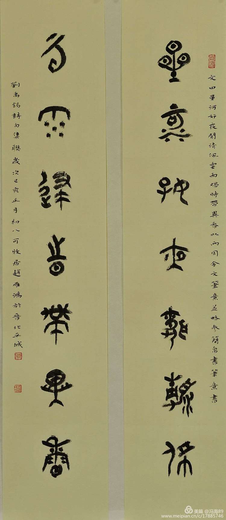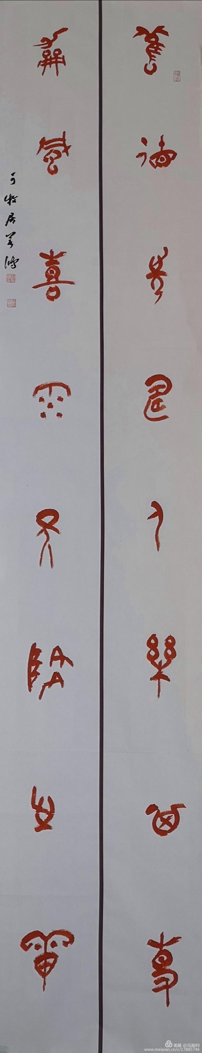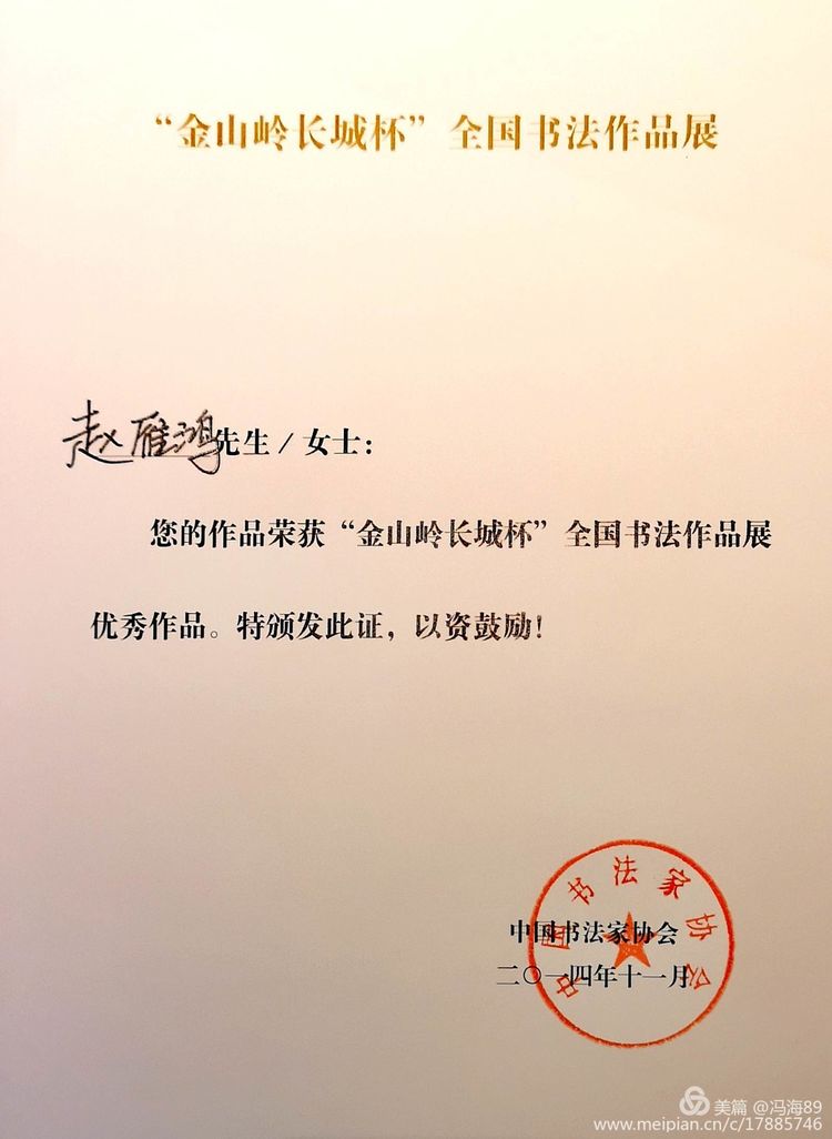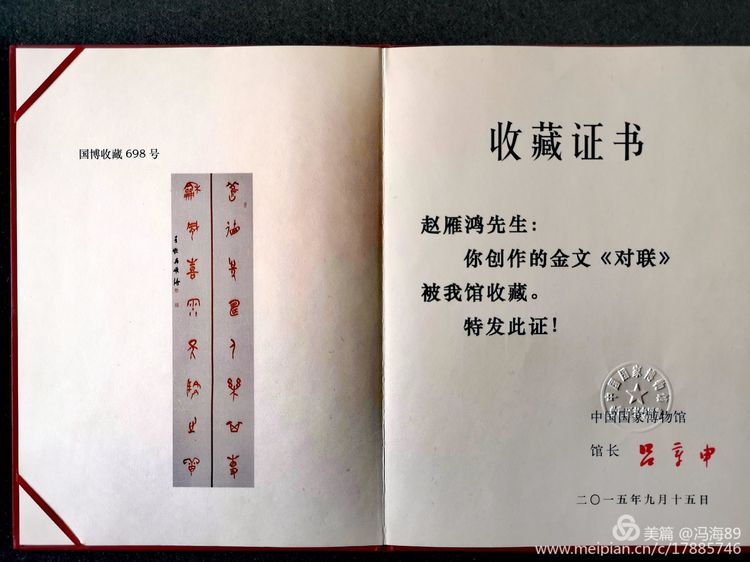 2014年,中國書協舉辦了一個專業大展,雁鴻的一副六尺對聯成功入選并獲獎,成為大同市建市以來獲得中國書協專業展覽大獎的第一人。2015年9月15日,國家博物館收藏了當代十位書家的作品,并舉行盛大儀式,前館長呂章申代表國家博物館為十位書法家頒發收藏證書,這其中,就有雁鴻的作品并且是唯一的一件大篆類作品入藏。眾所周知,在此之前,國家博物館只收藏1949年以前的并且是重大題材的作品,館藏當代健在書法家的書法作品還是第一次。這件作品融甲骨、金文、簡帛書等多種元素于一體,既拙樸渾厚、深沉蒼勁,有古質之風;又清麗溫婉、骨秀神清,具雅意之貌。可謂爽健之中寓蒼厚,渾融之間透清朗。至此,雁鴻的書法作品和書法地位,有了一個完美的歸宿,永久陳列于中華博物館級的最高殿堂,進入中華藝術長河,載入中華歷史的史冊!