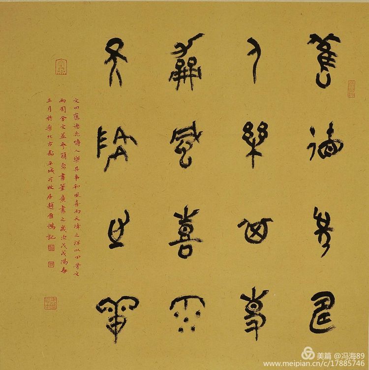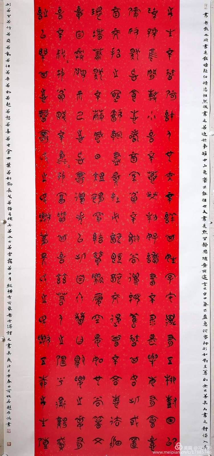 在清篆風靡書壇的當下,與兩千多年前的古人相遇,字貌表現都要受其檢閱,即便是終日對照摩寫也不見得攫其要領。在雁鴻看來,古人的影像,是“形”聚凝于二維,“神”幽渺于高維,今人以古人的影子來進行再創造,物象是次要的,“筆墨神韻”才是審美終極。所以今人習練書法,當是表現而非再現,當是神會而非拜會,是人作為主體意識對物象靈魂的心靈確認。誠如雁鴻老師王友誼先生所評價的那樣:“趙雁鴻的篆書,是很有現代意味的--以古出新,一方面又是新趣疊出……他積學崇古,筆挾元氣,韻余于筆,字里行間既有《散氏盤》力透紙背的崢崢之音,又不乏《石鼓》婉轉渾穆的廟堂氣象”。“他行筆輕盈而不乏碑版之厚重,結字高遠而得商周之神韻。墨氣淋漓處顯磅礴恢弘,牽絲凝練處透軒然正氣,處處給人以優游恰適、瀟灑超邁的審美感受。”
