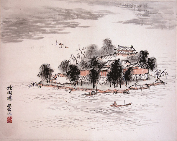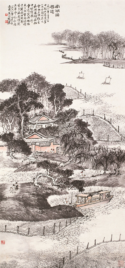 1961年,錢松嵒表現(xiàn)的煙雨樓正如同《乾隆南巡圖》中的煙雨樓一樣,是平常所見的名勝,也就是普通山水畫,或山水畫中的一邊一角。作為畫面的主體以非常完整的畫面構圖顯現(xiàn)出了傳統(tǒng)筆墨的神韻,用筆精簡,小中見大,表現(xiàn)出了煙雨樓不同一般的特別氣韻。將其與此前江蘇畫家旅行寫生中余彤甫的南湖寫生相比,可以看到上世紀50年代后期和60年代初所出現(xiàn)的變化和畫面的不同。在此后不斷發(fā)展的過程中,以煙雨樓所構成的湖心島這一景象的變化,在錢松嵒1957所畫煙雨樓上并沒有那條紀念船,和《乾隆南巡圖》的景象相當,近景的岸邊也是打魚的漁船,行走在湖面上的也是漁船。所以,這個時候雖然都是畫的南湖和煙雨樓,錢松嵒這個時期同樣所面對的都是中共一大會址,在表現(xiàn)上卻有了很大的不同。這個不同是因為有了紀念船,有了屬于一大會址的那條船,而更重要的是因為社會對于這一歷史的新的認識,以及社會對于藝術的新的要求。此后,錢松嵒多次畫南湖,紀念船卻成了主體。同樣是楊柳依依和楊柳掩映,畫面中景或突出地位上卻是那條紀念船。而紀念船同樣是靜謐地棲息在水面上,卻表現(xiàn)出了錢松嵒的新山水的樣式,這是新時代的風格和追求,再也不是舊文人表現(xiàn)山水的格局和氣度,更不是舊文人畫所表現(xiàn)的傳統(tǒng)山水的筆墨。這是一個時代的巨大變化,也是一個時代中畫面格局和意境的變化。