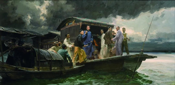 “建黨”題材與新中國主題美術創(chuàng)作中的其他題材有所不同,首先這是中國共產(chǎn)黨歷史的起點,其題材的意義不同一般,而在創(chuàng)作上也表現(xiàn)為不一般。這就是這一題材中的時間、地點、人物都是固定的。限于歷史資料的匱乏,發(fā)生在1921年的特定時間、地點和相關人物的具體細節(jié)有不確定性,則就成為創(chuàng)作中的難點。今天人們所了解的黨史中一大會議所經(jīng)歷的兩個會場,其表現(xiàn)都是有相當難度的。具體的代表、會址、場景、氛圍,以及人物的主次,歷史的真實與現(xiàn)實的要求等,在創(chuàng)作上都相當困難。主要表現(xiàn)為兩個方面:第一,與建黨事件直接關聯(lián)的上海一大會址和嘉興南湖的游船,誰為重點?第二,中共早期領導人與建黨相關的革命活動應該是什么?其中的難點和重點,以及可解與不可解的這些問題都是客觀存在的。