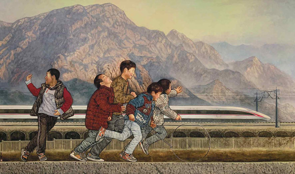 高鐵進(jìn)山啦(國畫) 210×360厘米 2019年 蔡超 邊濤 李鴻莉 國家主題性美術(shù)創(chuàng)作項目