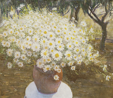 馮真在1956年到蘇聯列賓美術學院油畫系學習,1962年畢業歸國后在中央美院油畫系任教并進行創作。“我從列賓美術學院畢業后,不久就遇到‘文革’,所以油畫創作不多。后來我又轉到民間美術系,用很多精力和時間來收集和研究民間美術,離休后才又畫了一些油畫。”馮真說。展覽中,《北京西山秋色》紅葉似火、黃葉如金,《雛菊》清新淡雅,《陽光下的露臺》溫馨明媚,給觀者帶來歲月靜好的感覺。如杜鍵所說:“在他們后來的油畫和中國畫的創作中,都有新年畫創作中給他們烙下的純樸、樂觀、溫厚的印記。”