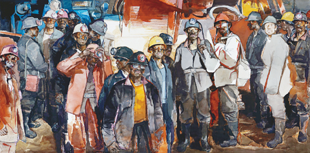 我們進入狀態(tài)開始作畫。半小時左右,礦工問我們:“好了嗎?”我用筆蘸著顏色,請他站起來休息,同時迅速將畫板鋪平,鋪畫大顏色。他站了一會兒,又坐回原處。我將第一遍顏色用電吹風(fēng)吹干,將畫板豎在畫架上繼續(xù)作畫,礦工已經(jīng)坐立不安,一會兒抬抬帽子,一會兒摸摸自己的臉,一會兒摳摳后背。我知道他勞作了整整一夜,現(xiàn)在最需要的就是躺倒休息。我心存內(nèi)疚卻又不肯停筆,我想把他的這種狀態(tài)準(zhǔn)確地表達出來,把勞動者辛苦的狀態(tài)表達出來。我抬眼與礦工的目光撞在一起,他不好意思地對我說:“沒啥,就是想睡。”就在此時,我?guī)缀跬浟怂械募记桑幌胗米疃痰臅r間將我面前這位疲憊的礦工迅速畫完。