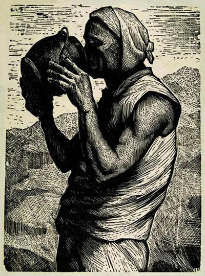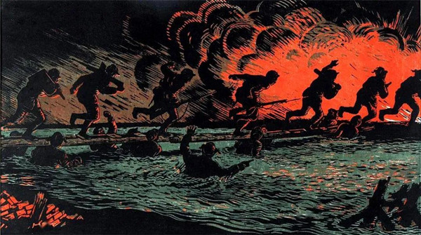 早在延安時期,木刻藝術(shù)家們便用手中的刻刀,表現(xiàn)黨領(lǐng)導下的人民軍隊始終與人民群眾勠力同心、并肩戰(zhàn)斗的情景。胡一川的《到前線去》、力群的《飲》、彥涵的《當敵人搜山的時候》、古元的《人橋》等經(jīng)典名作,以單純而有力的木刻藝術(shù)語言,成就了對于崢嶸歲月的視覺記錄與詩意表現(xiàn),展現(xiàn)了家國危難之時藝術(shù)創(chuàng)作的重要作用。