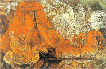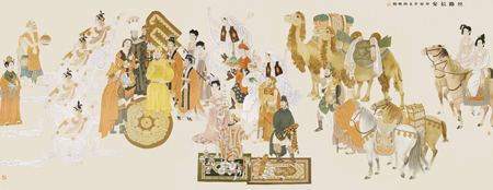 古今相通。若稍加留意就不難發現,楊曉陽的作品宛若一條金線,將歷史的文化碎片串聯起來并呈現給讀者。品讀其《遠古足音》,我仿佛看到了“盤古開天”“女媧補天”“嫦娥奔月”和“黃帝戰蚩尤”的壯觀場面;觀賞《愚公移山》,我仿佛看到一位老人召集子孫開會、商討移山的場景。這些遠古神話傳說又連接著《絲綢之路》《黃巢進長安》《黃河艄公》《沸騰的黃土地》,以及當代的《農民工》等。這里有數千年的文化積淀,使人感受到歷史的厚重與滄桑。楊曉陽仿佛用如椽大筆,在神州大地上書寫著中華文明史。他同時又將中外文化連在一起,《波斯新娘》使人看到異國風情,《生命之歌》使人看到異域文化,《草原盛會》使人賞析游牧文明的壯美,還有《梵音》《波斯雜技》《圣母之愛》等,無不呈現出異國、異域、異質文化的情調。楊曉陽筆下展現的既是中國古今文化,又是中外文化交流史。