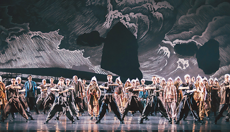 舞劇的第二幕叫《造雷》,一開幕那個作為膠東鄉村代表性事象的“石碾”,由下場門一側移到了上場門一側,仍然是20余名舞者的“意象化”呈現,但這次碾的是地雷炸藥配方的“一硝二磺三木炭”。同時,更多的鄉民及組織起來的民兵,就地取材造起了“石雷”——一段每個人跨著脖子掛著兩顆“石雷”的“民兵舞”,不僅英武而且智慧;更難能可貴的是,“海陽秧歌”的“小沉步”以區別于送殯隊的情態再一次出現,讓我們看到了這一民間舞蹈“主干動態”的多義性和可變性。此時石大爺歌喉昂揚起來:“這把骨頭呀/比石硬呀/鼓起勁頭呀/把山移呀/有風有雨呀/有啥難呀/守得云開呀/見天光呀。 ”既然是“地雷戰”,舞劇也把引爆地雷的方法細細琢磨,趙虎的絞盡腦汁,讓玉蘭深深地牽掛;但在玉蘭握住長辮恨莫能助時,趙虎卻從他的青絲中看到“觸發引信”的這段“牽掛雙人舞”寓“事”于“情”,在升華人物的情思之時推動著劇情的發展……進一步,編導干脆從玉蘭的長辮形象擴放出一隊輕盈、流暢的長辮女,但我們分明從這隊由上場門一側底邊淌出舞隊,看到了“如水月光”的意象——這“意象化”的月光映襯著玉蘭和趙虎的“心心相映”……
