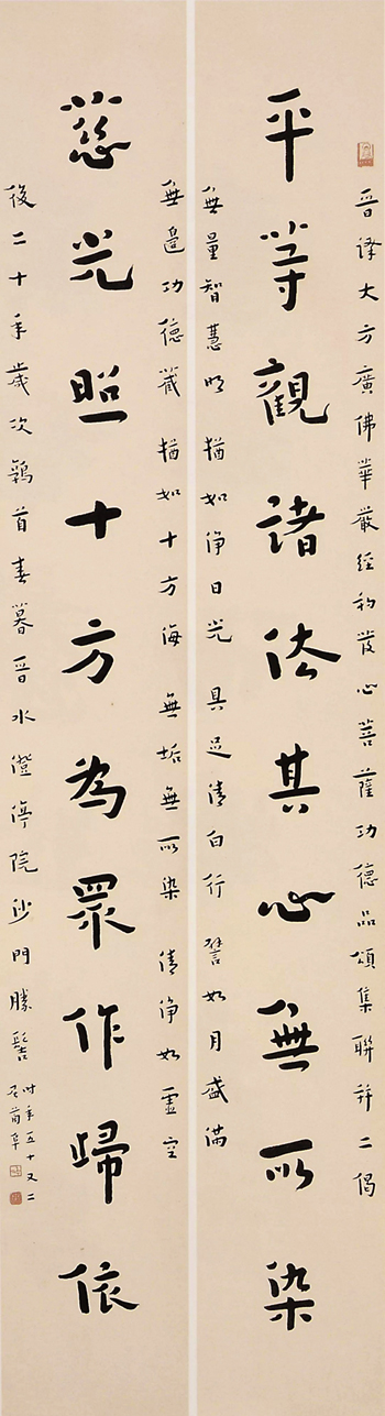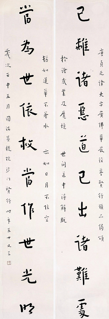 書法作為一種藝術(shù)形式,與李叔同生前努力并成就斐然的篆刻、音樂、話劇、教育等一樣,都是世俗人間精神追求的一部分,而他在杭州放下工作和家庭在大慈山定慧寺出家,則已經(jīng)宣告與這一切告別,他出家后本來準(zhǔn)備將書法創(chuàng)作與這些藝術(shù)形式一并放棄,但印光大師告訴他,可以用書法抄寫佛經(jīng)、題寫佛禪文字,以書法的形式弘揚(yáng)佛法。從此,弘一寫書法只寫佛法內(nèi)容,再不寫任何世俗社會(huì)的詩(shī)詞文章,包括名言警句。