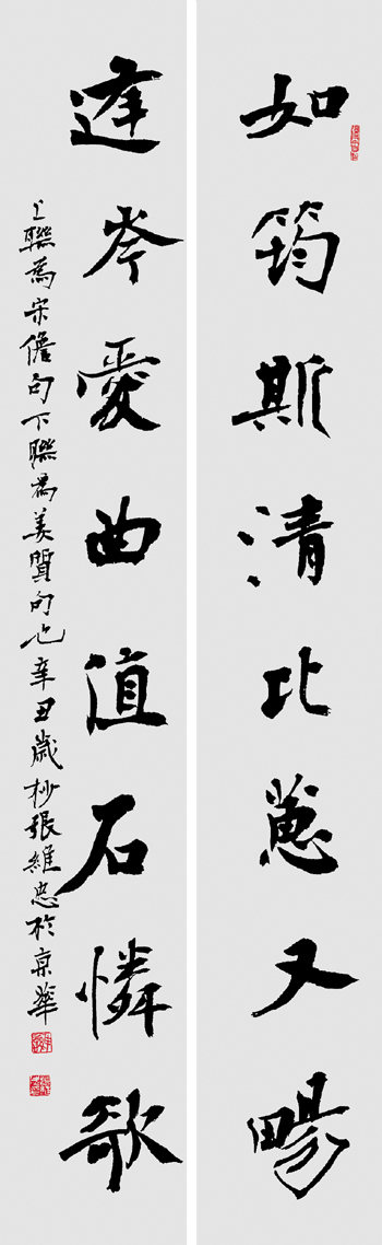 如何把北碑中的魏楷變成現(xiàn)代的魏楷,孫伯翔的探索還將北碑的滄桑漫漶與文人的淡泊典雅結(jié)合起來,使其魏楷清新有趣,顯示出從未見過的書卷之氣;李嘯的貢獻(xiàn)是將變化不定的北碑楷式進(jìn)行整理規(guī)范,呈現(xiàn)和創(chuàng)造出符合現(xiàn)代人審美的辨識(shí)分明的體例;而張維忠則是在北碑原有的基礎(chǔ)上強(qiáng)化其書寫性,讓金石刀刻還原于最初的筆墨書寫,賦予魏楷更多的靈性。張維忠雖然在書寫中受到《圣教序》《書譜》等帖學(xué)經(jīng)典的影響,但還不能將其看作是完整意義的碑帖結(jié)合,而是在展覽機(jī)制發(fā)生變化的情況下,對(duì)北碑魏楷的現(xiàn)代性改造,因?yàn)槠浠久婷彩冀K還是魏楷。他強(qiáng)調(diào):“在魏楷書寫的過程中,注重法度和速度的同時(shí),還要辯證借鑒其他書體的結(jié)字、用筆和意趣。”其創(chuàng)作“由碑入帖,又以帖融碑,碑帖相滲,自然生發(fā)。”這些是張維忠對(duì)傳統(tǒng)魏楷進(jìn)行改造的秘訣。被張維忠增加了書寫性的魏楷,似乎換了一種表情,看上去更加清朗雅逸,富有節(jié)奏音韻之感,無論是厚實(shí)還是纖秀,都寫得輕松、自然,平添了許多個(gè)人性情與筆墨的抒情成分,還智慧地把握住了楷與草的分寸,避免了一種超越法度的任性與不倫不類。這反映出張維忠對(duì)北碑魏楷書法的不同理解和思考。著名書法家張旭光說張維忠“以魏碑為基,揉入行草筆意,形成了空靈淡雅的魏楷書風(fēng)。”著名作家、書畫家韓靜霆將張維忠的書法特色概括為“雨打芭蕉、平沙落雁、一葦渡江、越女新妝。”四句話,四個(gè)典故,我理解是有境界、有詩情、有新意、有生趣等。2007年,中國書協(xié)原副主席旭宇先生提出的“今楷”理念,曾一度為書壇注目,他認(rèn)為張維忠這種以魏碑為主的楷書具有時(shí)代特點(diǎn),有“今楷”的意味。李鐸、孫伯翔等書法家對(duì)張維忠的探索都給予了充分肯定和高度評(píng)價(jià)。