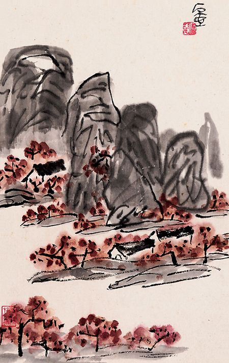 在創作大量花鳥作品之余,20世紀60年代,陳子莊多次走進廣元等巴山蜀水中,感受平凡家山的溫情,山石、樹木、房屋、點景人物、家禽牲畜的造型樣式、筆墨與結構皆是寫生中的思考與實踐,這一時期的《叢林冊》《壬寅冊》等山水畫作品,試圖在繼承中發揚,在創造中表現中國畫的意趣。
