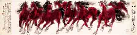 劉詠閣汗血寶馬的形象定位,是在參照各代范本的基礎(chǔ)上所進行的豐富的藝術(shù)處理,他從古籍畫卷中細細琢磨汗血寶馬的各種形態(tài)及精神特質(zhì),并進行了主觀精神性的詩意表達。在他的汗血寶馬繪畫中,我們可以看到他對經(jīng)典作品的解讀和發(fā)揚,他繼承了傳統(tǒng)中國畫中畫馬所注重的筆墨精神,同時又兼容了西方的造型意識和形式要求,形成獨特的藝術(shù)風貌和時代審美特征,創(chuàng)造出馬頭高昂、四肢修長、步伐輕盈、矯健有力、體態(tài)優(yōu)美、英姿凜然的汗血寶馬輪廓形象,以及有象征性、寓意性和心理超越的汗血寶馬審美基調(diào)。可以說,劉詠閣的汗血寶馬筆墨形象是他在馬種共性的基礎(chǔ)上加強了中國本土馬文化的家國概念,在視覺形象上進行了歸納概括,強化、突出和直觀表現(xiàn)了寶馬的共性特征與背后的隱喻性,將汗血寶馬的視覺形象與崇尚家國的審美期待有機結(jié)合起來,形成“紅裝墨相”的汗血寶馬審美意象——紅膚綠眼、豐胸肥臀——躍然而出,讓人耳目一新。