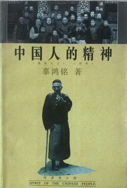《中國人的精神》1996年初版的封面上印著一張辜鴻銘身穿長袍馬褂、右手拄拐杖、左手捻長須的照片,前朝遺老味道十足。封底摘引了書中的一段話: