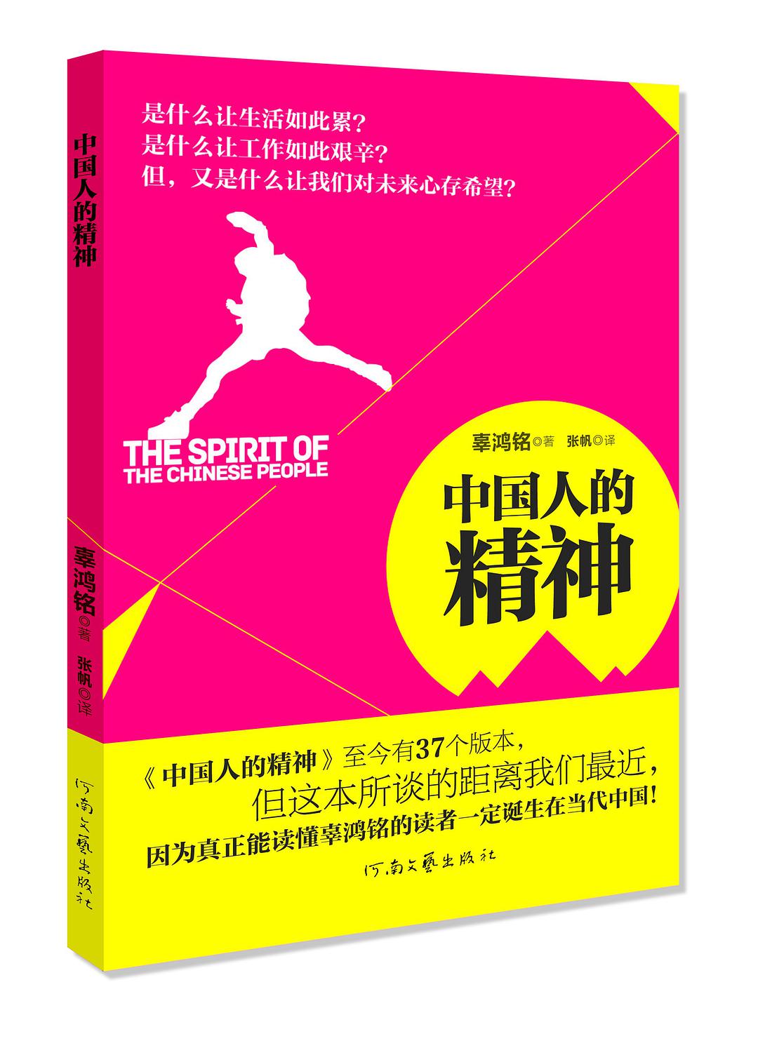 當然,最令人無法忍受的是那些將此書心靈雞湯化的營銷。例如2014年河南文藝出版社的版本,粉紅的封面上畫著一名走鋼絲的人,旁邊寫著三個疑問句:“是什么讓生活如此累?是什么讓工作如此艱辛?但,又是什么讓我們對未來心存希望?”接著更讓人噴飯的語句出現在黃色腰封上:“《中國人的精神》至今有37個版本,但這本所談的距離我們最近,因為真正能讀懂辜鴻銘的讀者一定誕生在當代中國!”