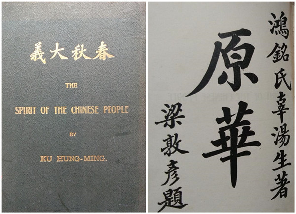 《中國人的精神》是英文書名The Spirit of the Chinese People的直譯,辜鴻銘其實還給它取過一個中文名字叫《春秋大義》,借此強調孔子在《春秋》里包含的“尊王攘夷”、“名分”等微言大義。其次在原書扉頁上還有時任袁世凱政府交通總長的梁敦彥為之題簽的一個頗具傳統特色的書名《原華》。所以,這本書實際上一共有三個名字,但顯然,只有使用英文書名的翻譯才能具備成為暢銷書的條件。
