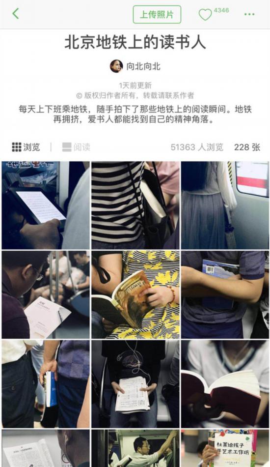 豆瓣相冊(cè)“北京地鐵上的讀書(shū)人”,目前有五萬(wàn)多瀏覽。截屏圖