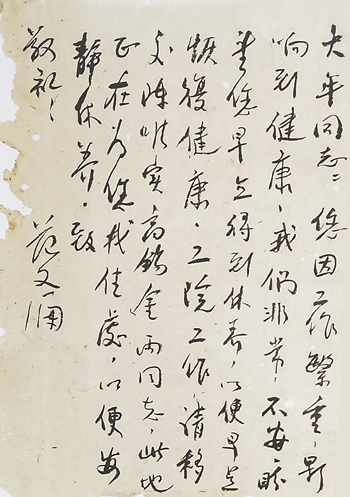 范文瀾故居陳列著范文瀾致劉大年的信函。“大年同志:您因工作繁重,影響到健康,我們非常不安,盼望您早點(diǎn)得到修養(yǎng),以便早點(diǎn)恢復(fù)健康。工院工作,請(qǐng)移交陳唯實(shí)、高錫金兩同志,此地正在為您找住處,以便安靜修養(yǎng)。致敬禮范文瀾”。