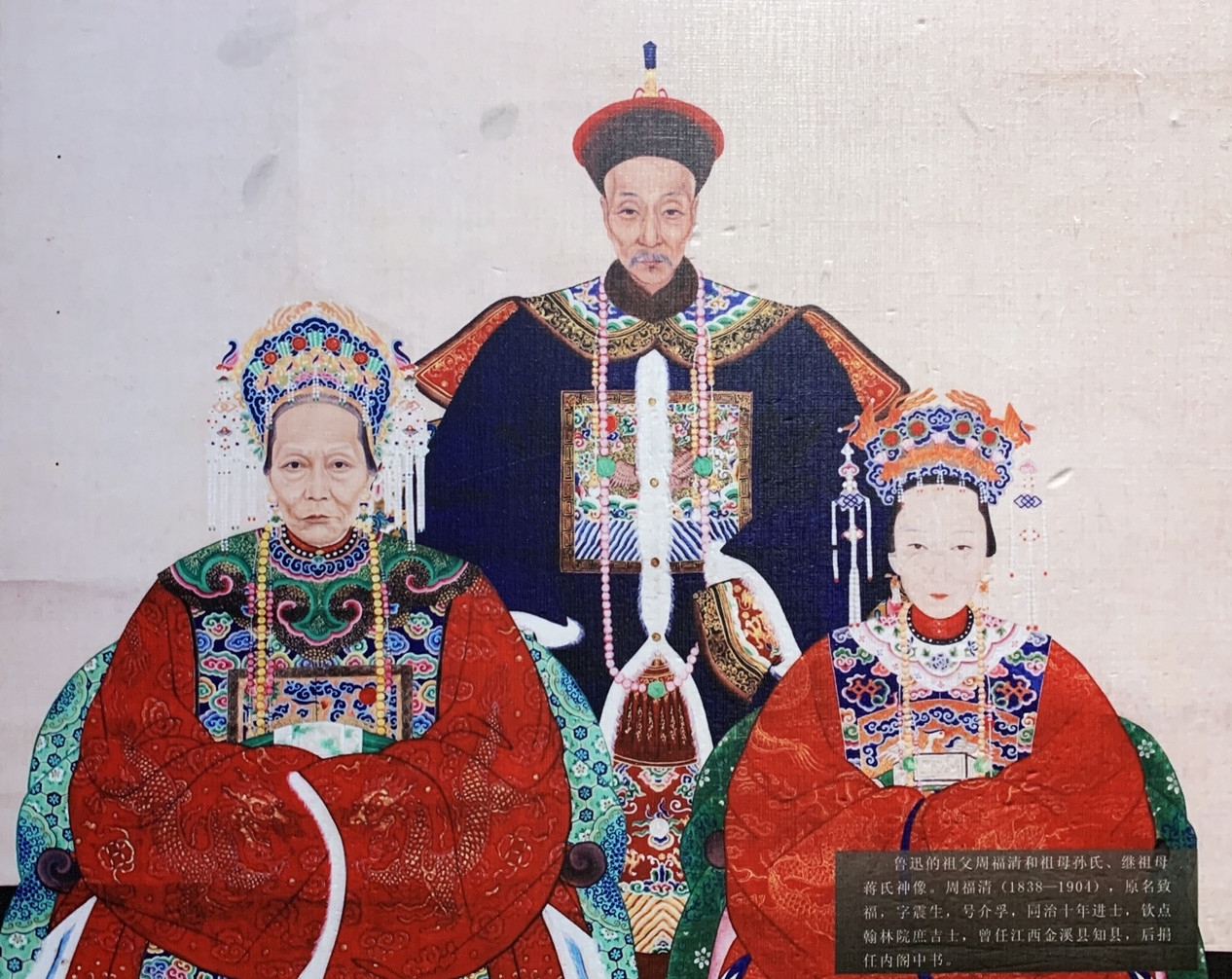 魯迅的祖父周福清(字介孚,1838-1904),同治十年進(jìn)士,欽點(diǎn)翰林院庶吉士,曾任江西金溪縣知縣,后捐任內(nèi)閣中書。后因科場案入獄。圖為紹興魯迅故居內(nèi)魯迅祖父周福清和祖母孫氏、繼祖母蔣氏的畫像。
