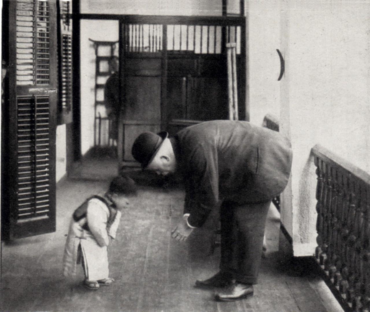 杭州廣濟(jì)醫(yī)院院長梅藤更在巡視病房時(shí)跟一位三歲小病人互致問候(沈弘教授提供)