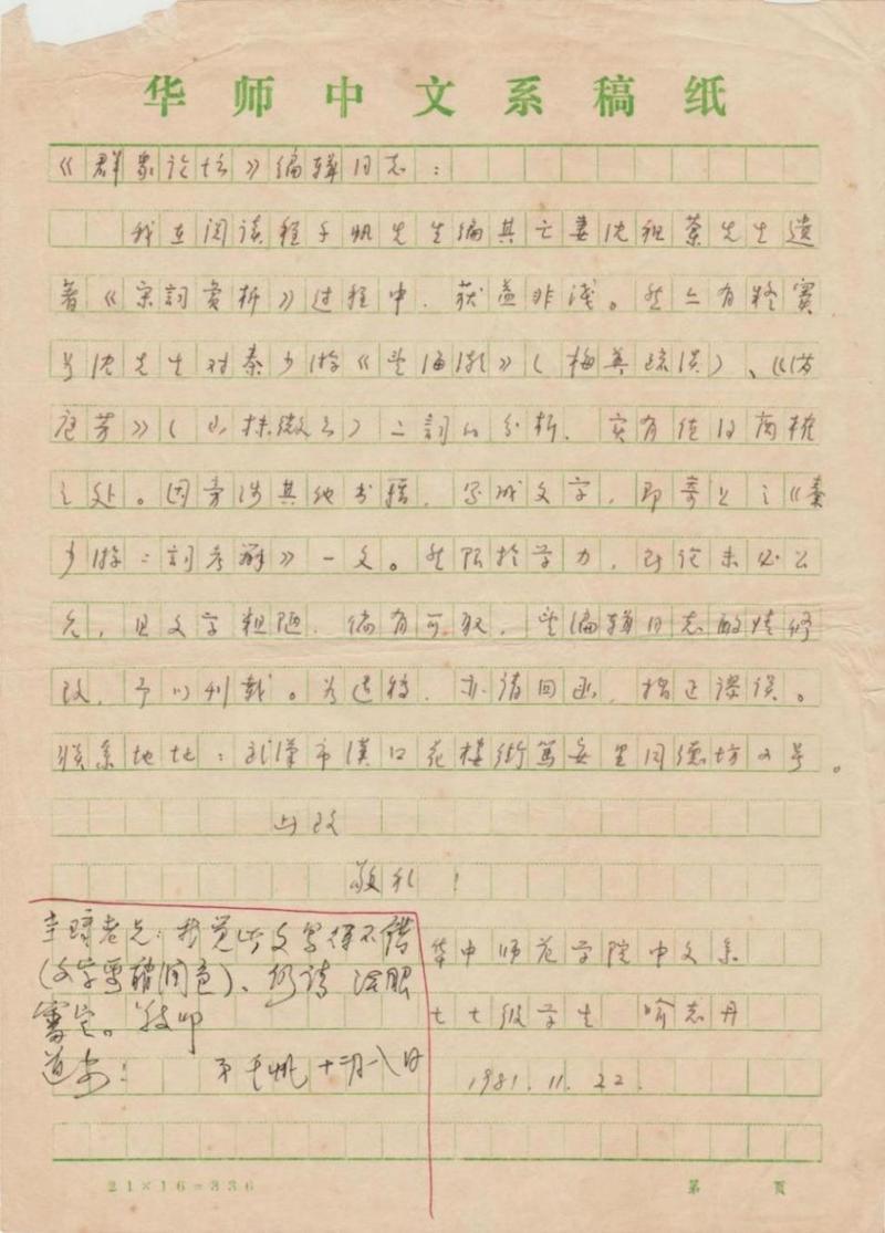 1981年12月7日下午,《江海學(xué)刊》的兩位編輯許總、曹朋來到南京大學(xué)教授程千帆家,將一篇商榷文章放到他的案頭,同時(shí)還出示了文章作者寫給雜志社的信。文章針對(duì)的是由他整理的沈祖棻遺著《宋詞賞析》,其中關(guān)于秦少游兩首詞的分析,這位作者——華中師范學(xué)院中文系七七級(jí)學(xué)生喻志丹——有不同看法?!度罕娬搲?叢)》編輯同志(按:《江海學(xué)刊》在1980年曾更名《群眾論叢》,1982年恢復(fù)):