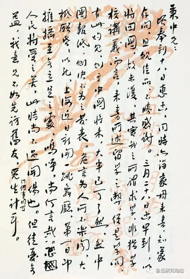 今日閱報(bào),驚悉先生逝世,雖是在辦公室中,不禁伏案慟哭。秉中之得有今日,皆先生之賜。十年來奔走不寧,未能償侍先生講學(xué)之志,誠可痛心。然平日對人處事,一體先生真誠態(tài)度,不敢有辱先生,此敢告我先生在天之靈者也。海嬰弟方數(shù)歲,教養(yǎng)之責(zé),全在師母。伏望節(jié)哀,毋損尊體,以肩巨任。回思前日在滬,先生云“病中亦不能停筆休養(yǎng),因停筆不單醫(yī)藥遂停,即飯亦不得吃也”。痛哉此言,秉中返京二十余日來,晨夕耳中皆如聞先生此言,然又束手無策,不能有所奉助。時(shí)時(shí)懷念先生病體,而俗務(wù)累人,竟未能奉書問候,而今竟成終天之憾事。前次先生面允書數(shù)字見賜,病中當(dāng)尚未書就,敢請師母覓先生所書物事賜寄,以存手澤。