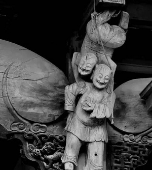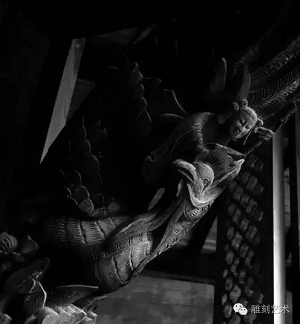 混雕:相當(dāng)于雕塑技法里的圓雕,具有三維主體的效果,可多面觀賞,多應(yīng)用于撐拱、垂花等部位,常利用混雕技法,將形象刻畫得非常精細(xì),充滿生氣。
