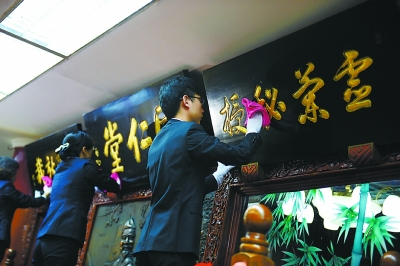 每年“二月二”龍抬頭,老字號同仁堂藥店會舉行一次老傳統——凈(敬)匾儀式,三位優秀員工要擦拭“同仁堂”金字匾額以及兩塊配匾。