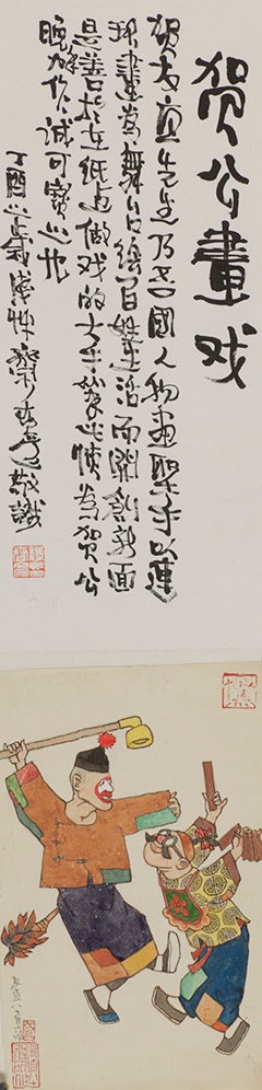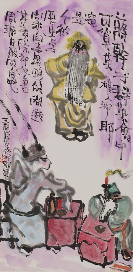 戲曲人物畫創(chuàng)作,從其藝術(shù)趣味和文化品質(zhì)而言,大體分為借戲入畫和入戲生畫兩類。前者重在形式融合,后者重在精神契合。前者以林為代表,林風(fēng)眠的戲曲畫是最具現(xiàn)代繪畫意識的。他注重的是通過戲曲舞臺形象進(jìn)行新的繪畫形式與觀念的探索,或者借用舞臺情節(jié)故事的形象再創(chuàng)造,表達(dá)自己內(nèi)心強(qiáng)烈的情感體驗(yàn)。因此,他的戲曲人物畫的“戲味”并不濃厚,更多的是借題創(chuàng)作一種獨(dú)特的戲曲畫“重構(gòu)”形式。20世紀(jì)5O年代林風(fēng)眠開始思考“從舊戲的動作分化后再設(shè)法構(gòu)成創(chuàng)作,在畫面上或者可能得到時(shí)間上綜合的觀念。”如《水漫金山》通過壓平折疊空間,將主體人物與其他表現(xiàn)對象同置放于一個(gè)平面,對于舞臺人物的連續(xù)動作進(jìn)行分化和再構(gòu)成。《寶蓮燈》將主要人物和背景事物通過切割線,并置于畫面上,形成幾度空間呈現(xiàn),使得戲劇情節(jié)獲得時(shí)間上的錯(cuò)覺延續(xù)。在傳統(tǒng)濃墨重彩的技法上推陳出新,結(jié)合西畫之中覆蓋法表現(xiàn),適當(dāng)加以水粉著色,使畫面色彩濃重而飽滿,獨(dú)特地體現(xiàn)出一種融和中西的綜合之美。后者則以關(guān)良為端倪,關(guān)良是現(xiàn)代最早將中國傳統(tǒng)文人水墨語言引入戲曲人物畫的大家。他在追求形神兼?zhèn)涞耐瑫r(shí),常運(yùn)用沒骨寫意的手法描繪戲曲人物,運(yùn)用“鈍、滯、澀、重”的筆墨手法,并善于對人物形態(tài)的夸張變形,充分展現(xiàn)文人畫傳統(tǒng)的寫意天趣,并將西方現(xiàn)代表現(xiàn)主義的某些語言融入其水墨戲曲人物畫創(chuàng)作之中。關(guān)良的戲曲人物畫注重追求表現(xiàn)戲曲舞臺的精彩瞬間,抓住最突出的故事情節(jié)或人物性格的動作和表情,講究人物比例重心,以及動作上的合乎舞臺板眼節(jié)奏,創(chuàng)作一種獨(dú)特的戲曲畫“瞬間”形式。觀其畫似觀戲,而且大有勝似觀戲的文化回味,以表述戲曲舞臺的真實(shí)形態(tài)為主要目的,包括舞臺人物和舞美(道具、服飾、布幕等),非常寫實(shí)和接近舞臺實(shí)況,記錄了許多經(jīng)典曲目的最精彩的瞬間。