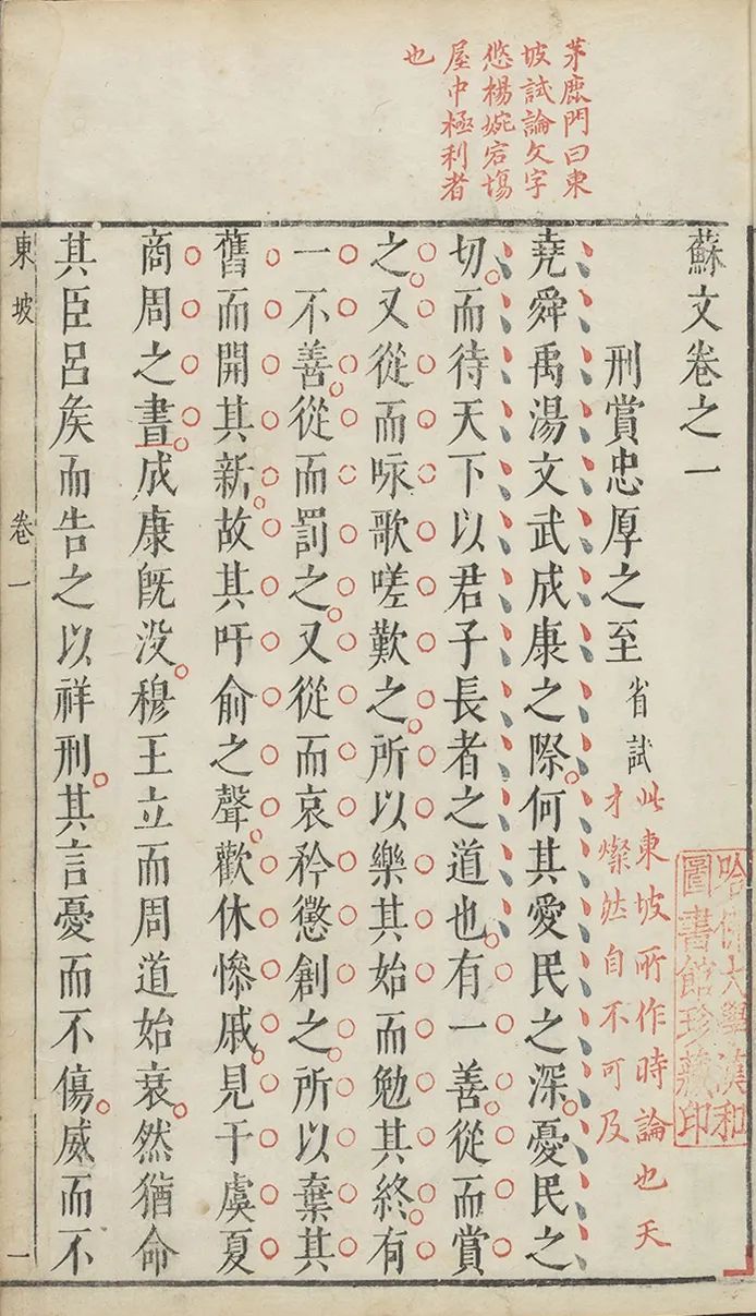 25 閔爾容輯評:《蘇文》卷首,明崇禎間烏程閔氏刻朱墨藍三色套印本。