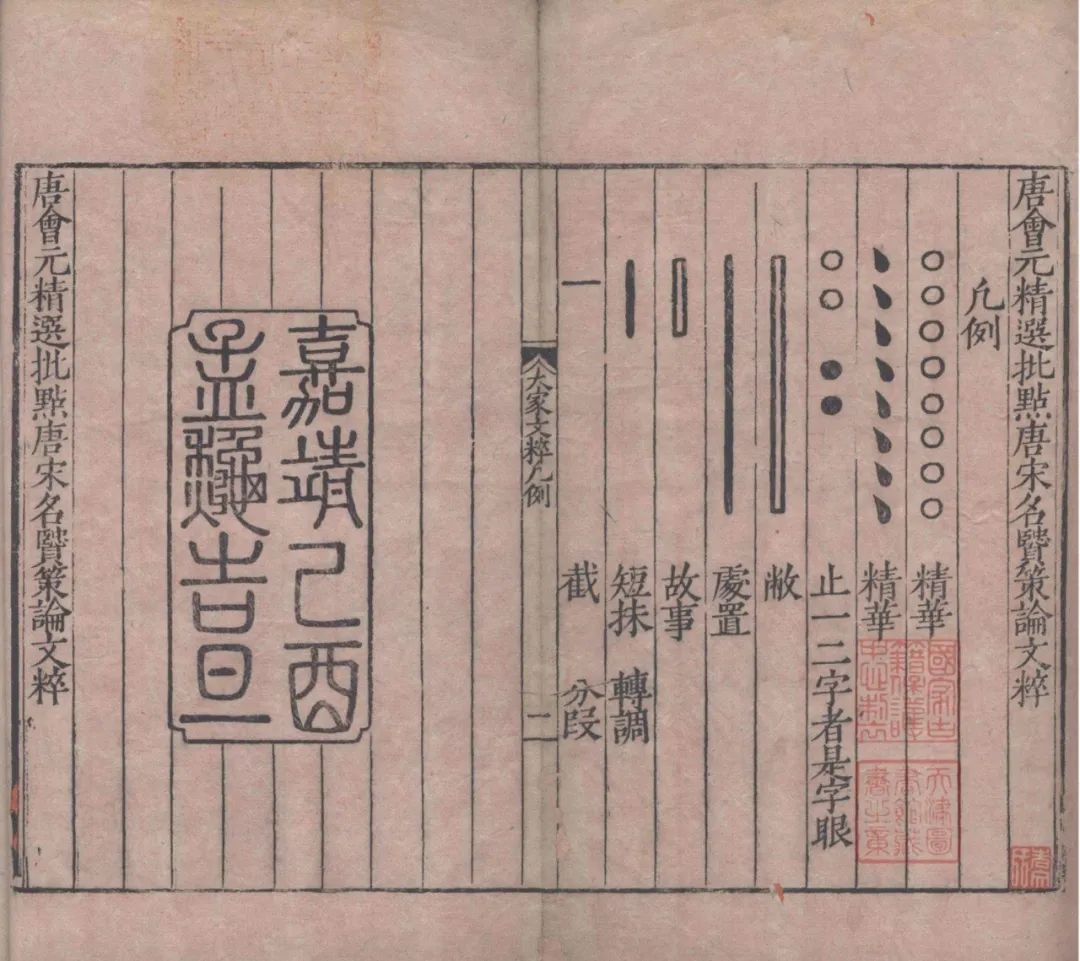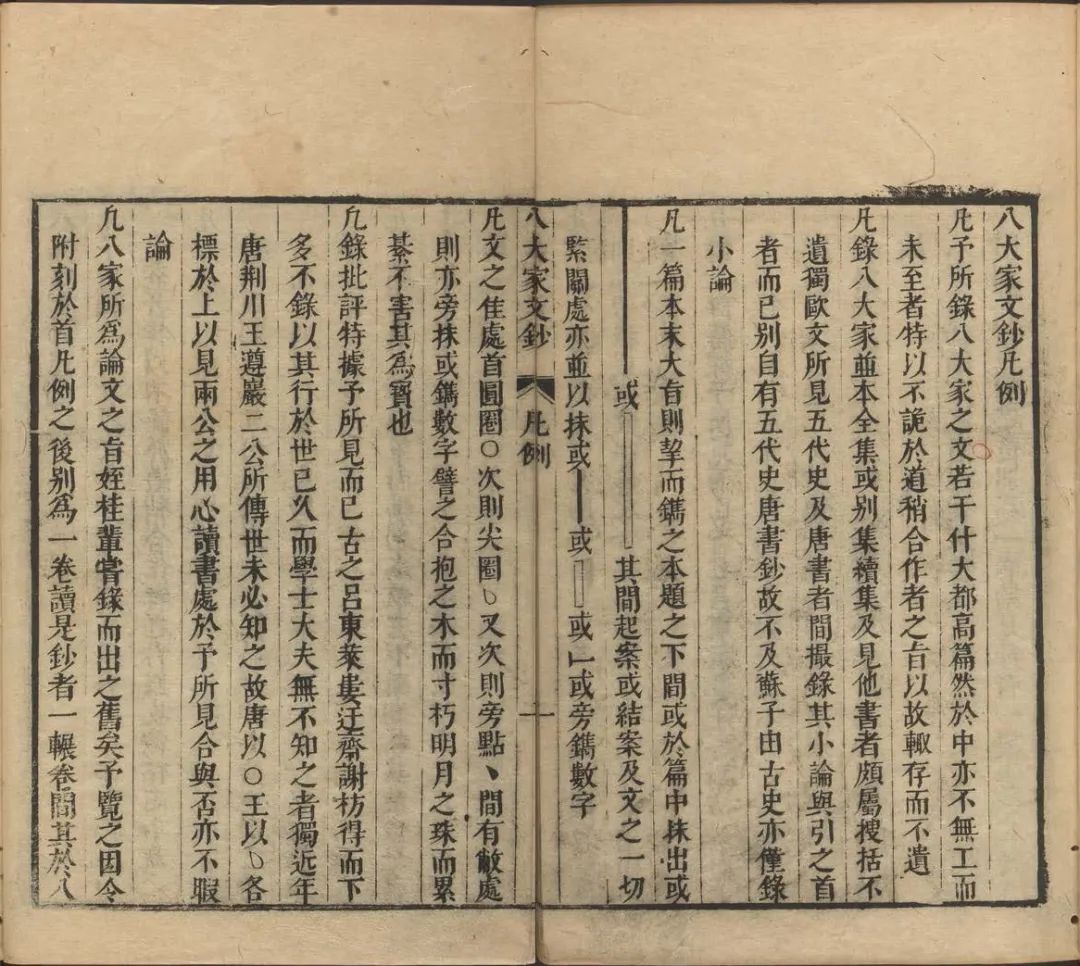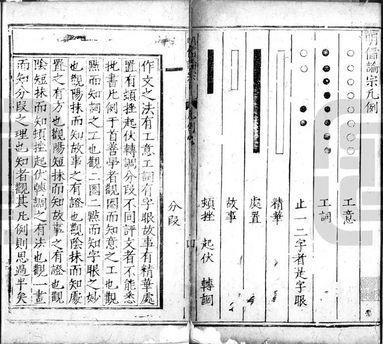 作文之法,有工意、工詞,有字眼、故事,有精華、處置,有頓挫、起伏、轉調、分段不同。評文者不能悉批,書凡例于首。善學者,觀圈而知意之工也,觀點而知詞之工也,觀二圈二點而知字眼之妙也,觀陽抹而知故事之有證也,觀陰抹而知處置之有方也,觀陽短抹而知故事之有證也,觀陰短抹而知頓挫、起伏、轉調之有法也,觀一畫而知分段之理也。知者觀其凡例,則思過半矣。29