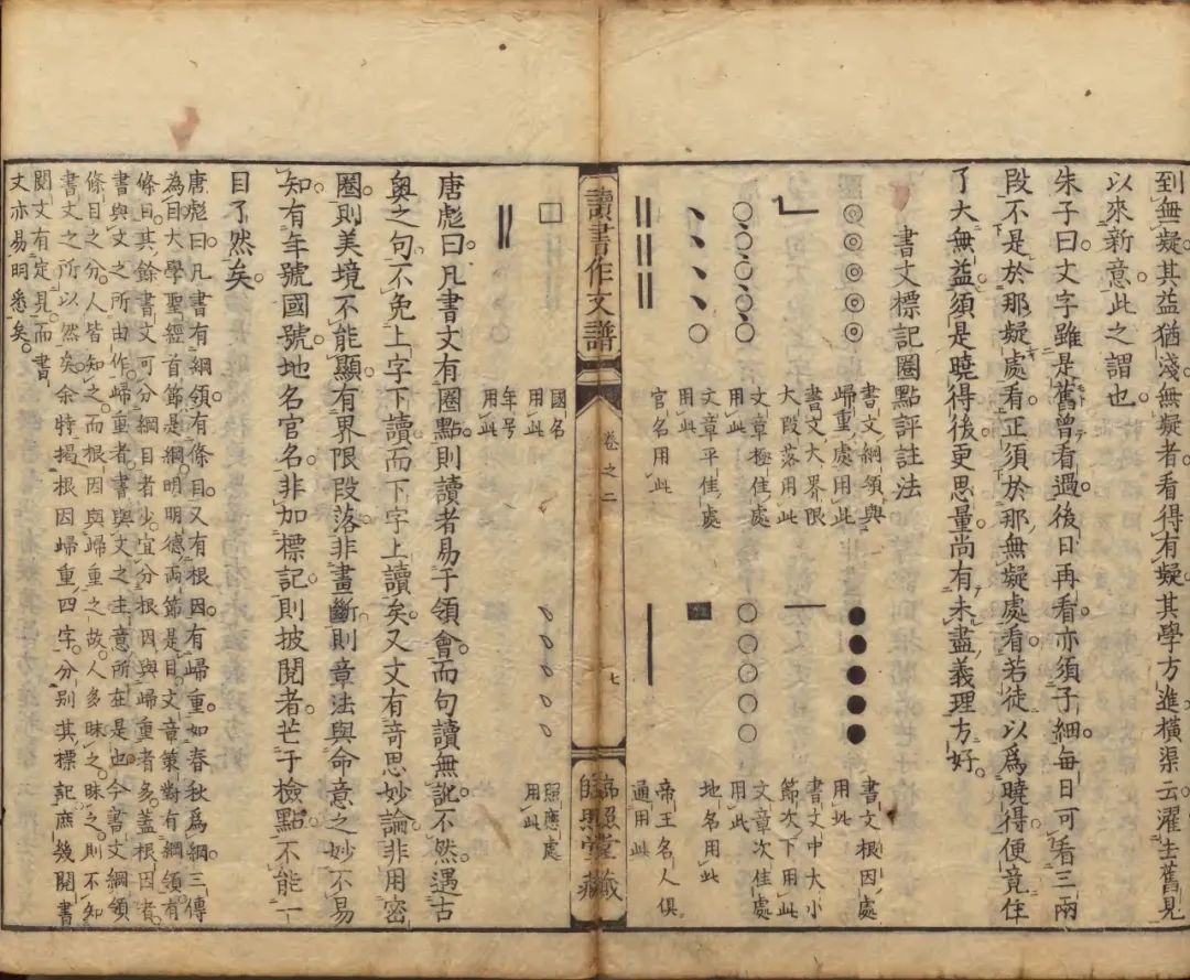 除了對聲音的關注,清人的閱讀理論對圈點運用也作了更深入的分析,出現了如清初唐彪《讀書作文譜》一類細致論述讀書法的專書。該書列有《書文標記圈點評注法》,指出“凡書文有圈點,則讀者易于領會,而句讀無訛”43,將圈點之法融入到閱讀理論之中,既便于讀者斷句識文,也有助于領會文章精華和寫作技法。分析晚明至清初文論家有關書籍閱讀的相關論述,有助于我們從文字以外的符號、聲音等視角去考察古代的讀書及作文法。