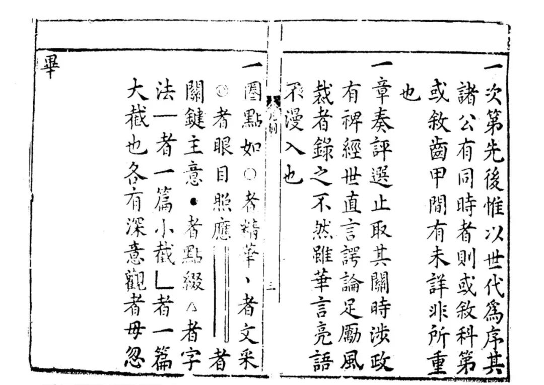 一是以圈點符號來標示選文的評價等級。例如晚明的舉業用書《新鐫選釋歷科程墨二三場藝府群玉》,由衢州書坊翁日新刻印。此書署焦竑、王衡同選,唐汝瀾注,邵名世、王時學同校,翁日新繡梓。焦竑、王衡之名當系偽托,實際的編選、注釋工作應由唐汝瀾承擔。唐汝瀾對所選科考二三場中論、表、判、策程墨的等級評選,皆以圈點作為標示。對此,書前《新鐫選釋歷科程墨二三場群玉圈點凡例》有清晰的說明: