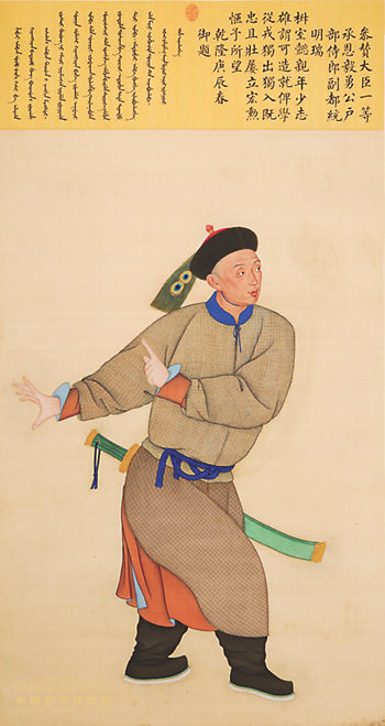 《明瑞像》中,貴公子富察·明瑞兩手向后,身體半蹲扭向前方,眼斜視前方,動作頗為“銷魂”,卻是他的一個經典動作。明瑞是承恩公富文之子、大學士傅恒之侄,清中期名將,因平叛、征緬有功,封一等誠嘉毅勇公。朱萬章介紹,“明瑞是將軍,要帶兵打仗,經常要操練士兵,他要教士兵做動作,所以圖上所畫的是他長期以來最經典的一個動作。”