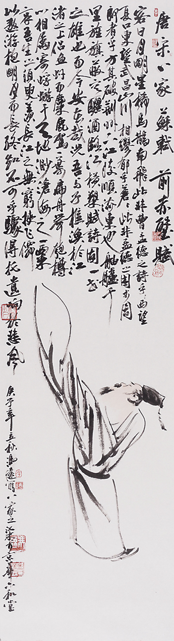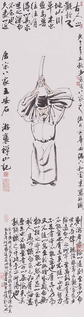 馮遠的人物畫“唐宋八大家”系列,比之“先秦諸子”系列,筆墨更為開張、簡練,凸顯出文人放達的性情和復雜的性格。韓愈、柳宗元、蘇氏三父子、歐陽修、曾鞏等人,文章蓋世,事功驚人,復合型的身份讓他們在政治與文章中游走,人格飽滿又深刻。“唐宋八大家”系列的書法長跋讓人耳目一新。當代國畫的書法缺失,早已引起有識之士的憂慮。沒有毛筆字題款的國畫作品,會降低當代國畫創作的品質。因此,要求當代國畫家提高書法水平的呼聲越來越高。馮遠注重書法的研習,注意書法對畫作的促進與提升。1977年他在浙江美術學院攻讀研究生,三年的系統學習,讓他認識了神秘而博大的傳統藝術世界。浙江美術學院(今中國美術學院)重視書法,是最早設置書法專業的美術學院,當然要求美術學院學生也要學習書法。馮遠在青少年時代染指丹青,也弄翰墨,進入大學,勤于臨帖,鑄就了自己的筆墨功夫。他的畫作,書法占比較大,“唐宋八大家”系列就是證明。他大幅度題跋,有的是抄錄所繪人物的詩文,有的是書寫個人的感受、感想,以不同的文辭,不同的書體,強化畫作的文化含量。書法對國畫有文辭和筆墨的雙重推進,前者是主題深化,后者是藝術手段,這一點,牛克誠一語中的:“馮遠的人物畫,通過讓堅實的造型功底與書法式的抒情筆墨結合,讓現實主義的創作題材與厚重博大的精神傳統相聯結,建立起具有鮮明時代感的語言形式。”